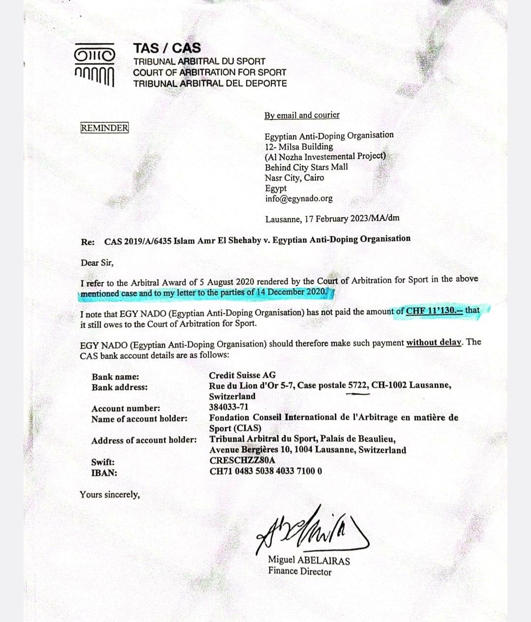 وأضاف: "هذا المسؤول تسبب في تكبد المنظمة المصرية غرامات مالية بسبب سوء إدارته، ودفعت المنظمة غرامات مالية وقعت عليها أثناء فترة إدارته في 20218 و2020، وغيرها من الوفائع المثبتة".