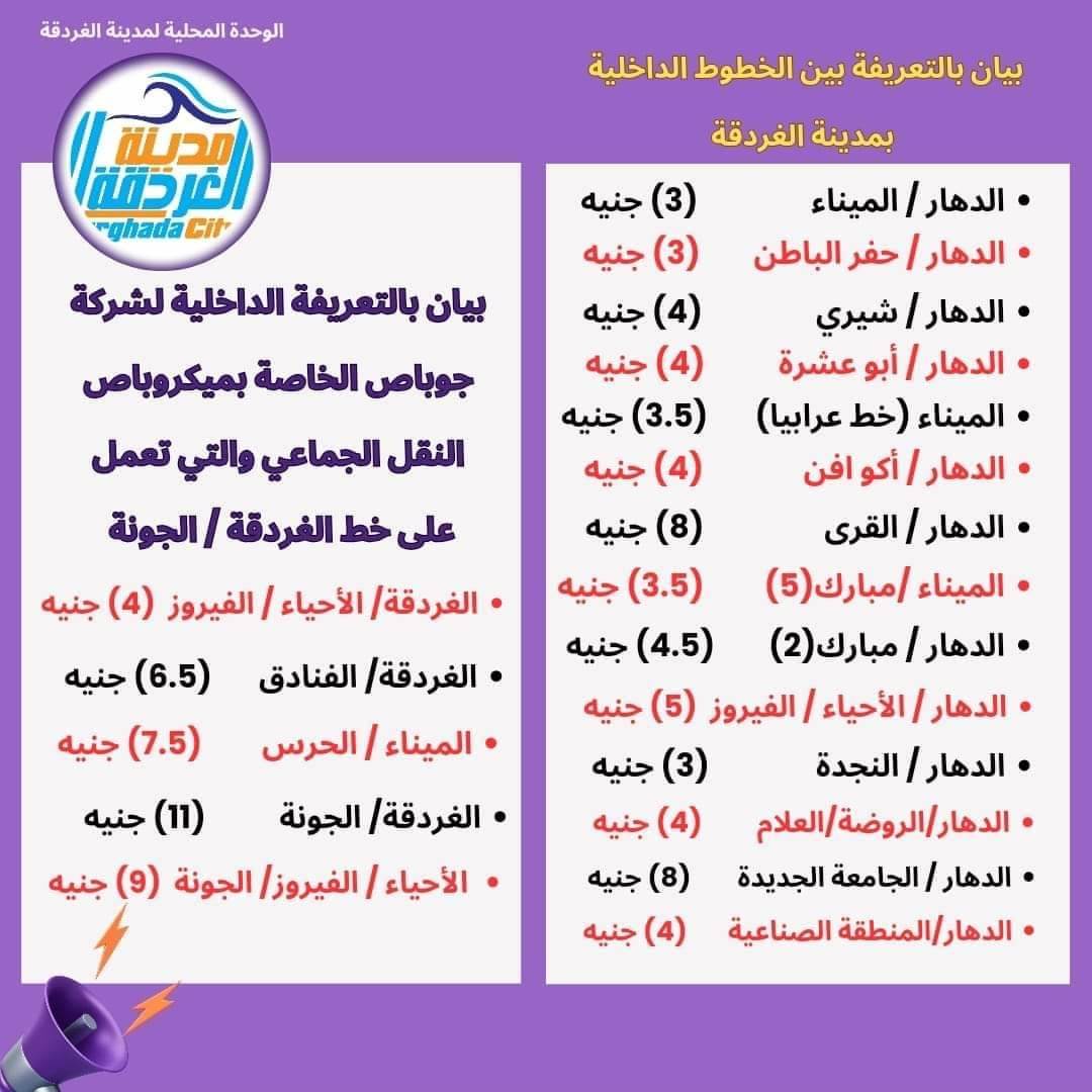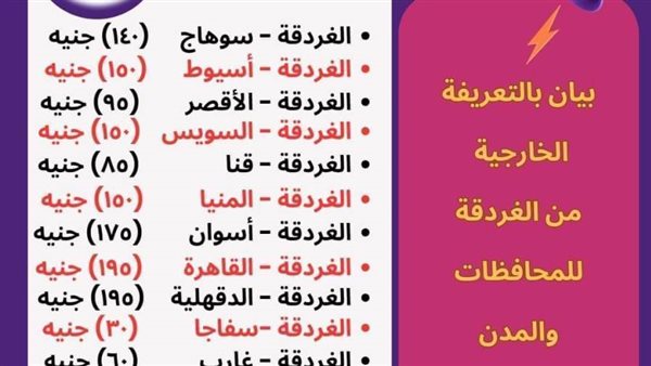 اصدر اللواء عمرو حنفي محافظ البحر الأحمر، قرارًا، بتعديل التعريفة الجديدة والمقررة لركوب سيارات الأجرة والسرفيس بدائرة المحافظة، وذلك على إثر زيادة أسعار البنزين والسولار الذي أقره وزير البترول والثروة المعدنية.
