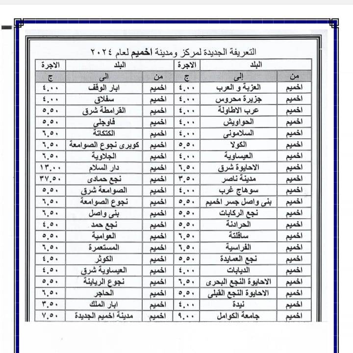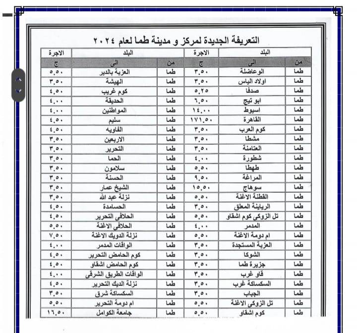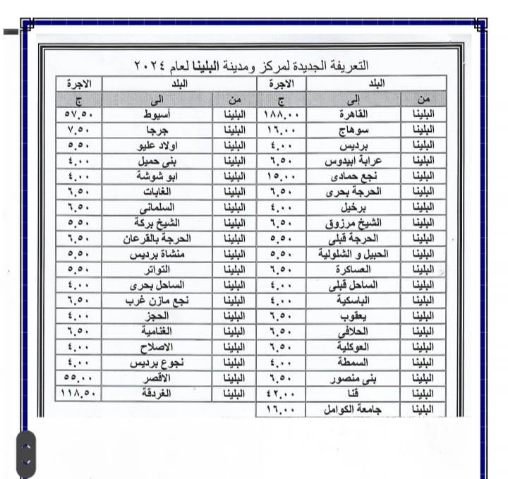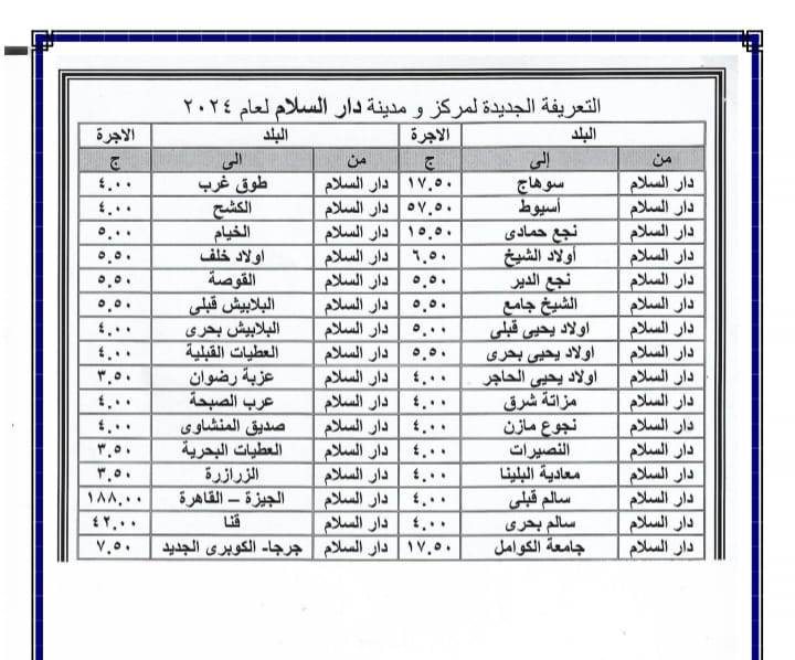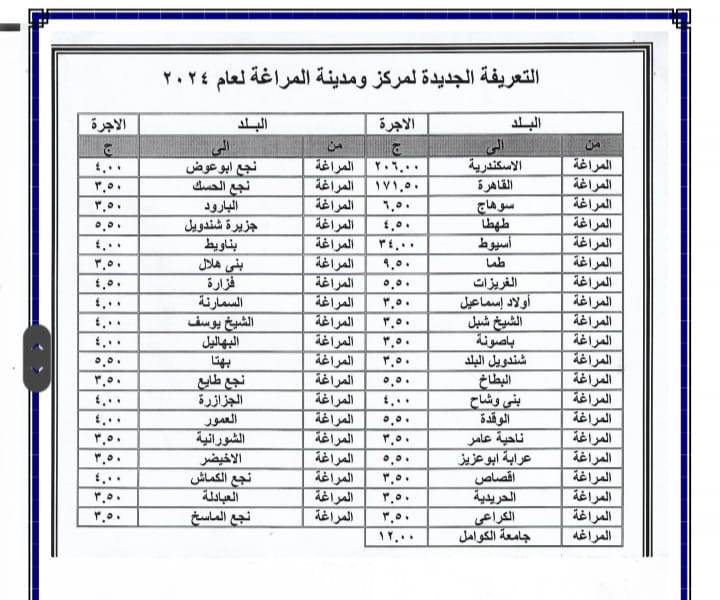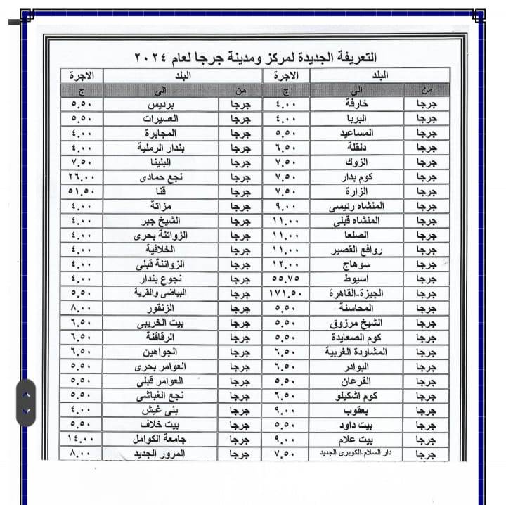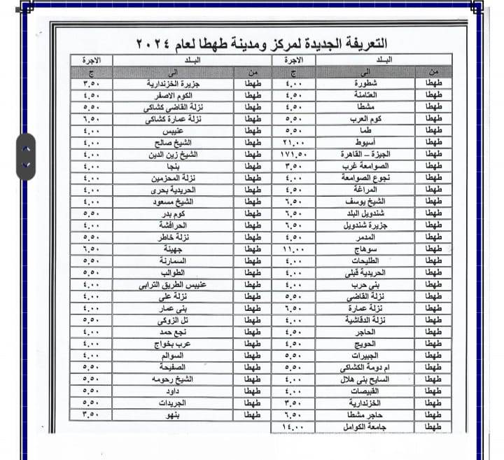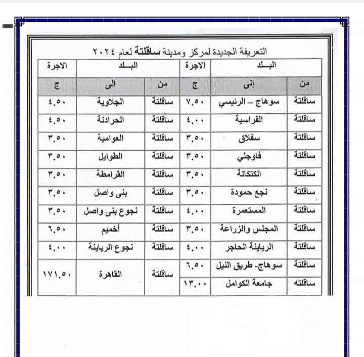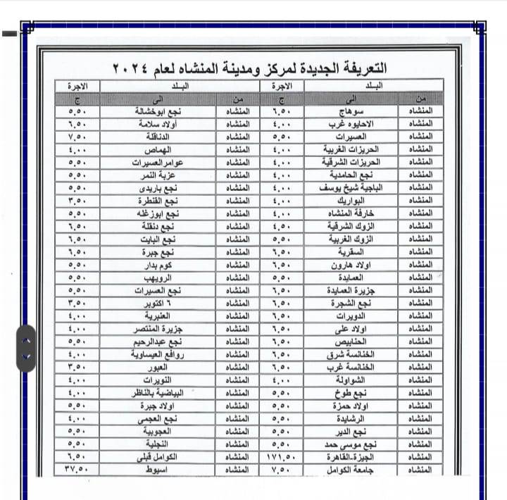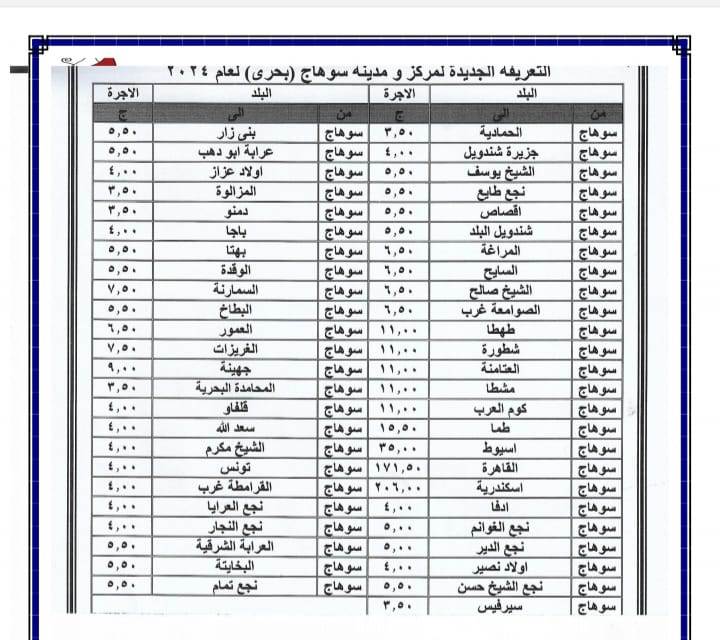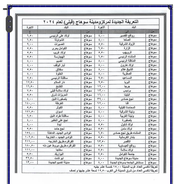 أصدر اللواء عبد الفتاح سراج محافظ سوهاج منذ قليل قرار جديد بشأن تعديل تعريفة الأجرة للمواصلات الداخلية والخارجية وسيارات نقل الركاب السرفيس والتاكسي بالعداد داخل المحافظة وبين المراكز وحصلت بوابة روزا اليوسف على نسخة منه . ويأتي ذلك عقب قرار لجنة التسعير التلقائي للمنتجات البترولية بزيادة أسعار البنزين والسولار وغاز تموين السيارات