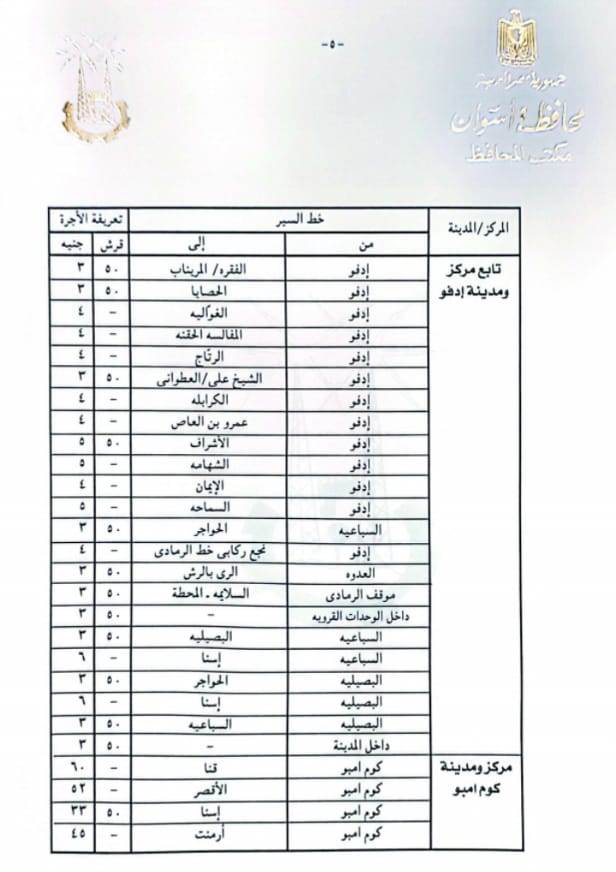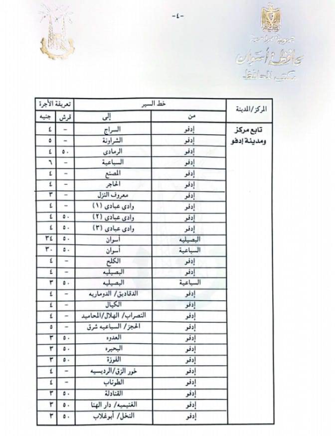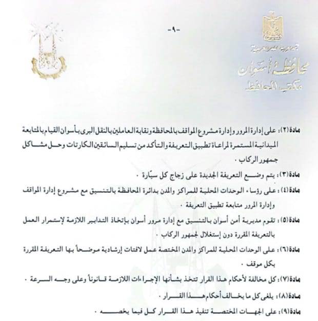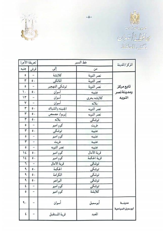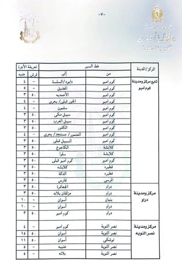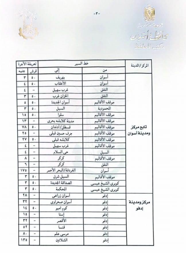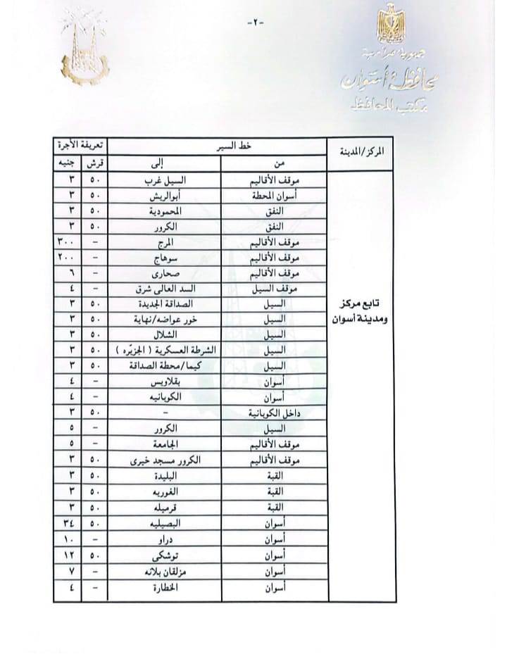 محافظ أسوان يعتمد تعريفة الأجرة للمواصلات الداخلية والخارجية بزيادة تتراوح ما بين 10% إلى 15%