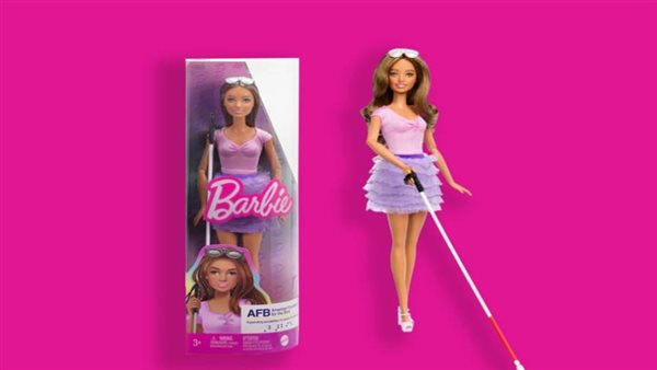 طرح أول دمية باربي كفيفة مع عصا وصندوق كُتب عليه بطريقه برايل