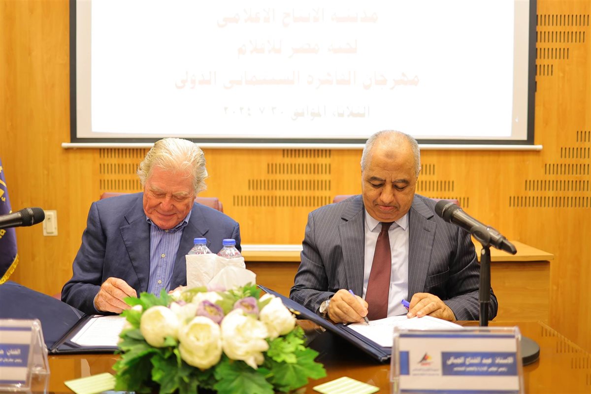 وقع بروتوكول التعاون الفنان حسين فهمى رئيس مهرجان القاهرة السينمائى والوزير الصيني شن هاى شيونج عضو اللجنة المركزية للحزب الشيوعي الصيني ورئيس مجموعة الصين للإعلام ومسؤول قطاع السينما والأفلام.