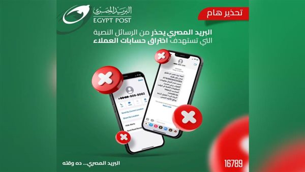 ويدعو البريد المصري جميع المواطنين إلى عدم التفاعل مع مثل هذه الرسائل، أو الضغط على أي روابط ترد من أرقام مجهولة، وفي حال ورود أي استفسارات أو شكاوى يرجى الاتصال بالخط الساخن 16789.
