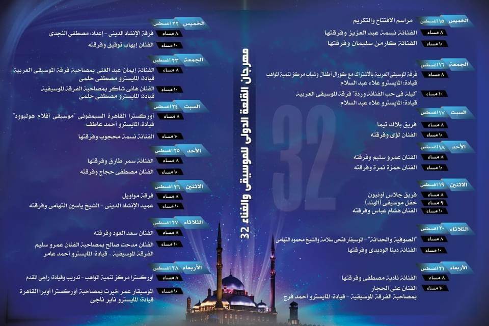يذكر ان الدورة ٣٢ من مهرجان قلعة صلاح الدين الدولى للموسيقى والغناء تتواصل على مدى ١٤ يوم وتقام فى الفترة من الخميس ١٥ اغسطس حتى الأربعاء ٢٨ أغسطس وتضم ٣١حفل متنوع على مسرح المحكى.
