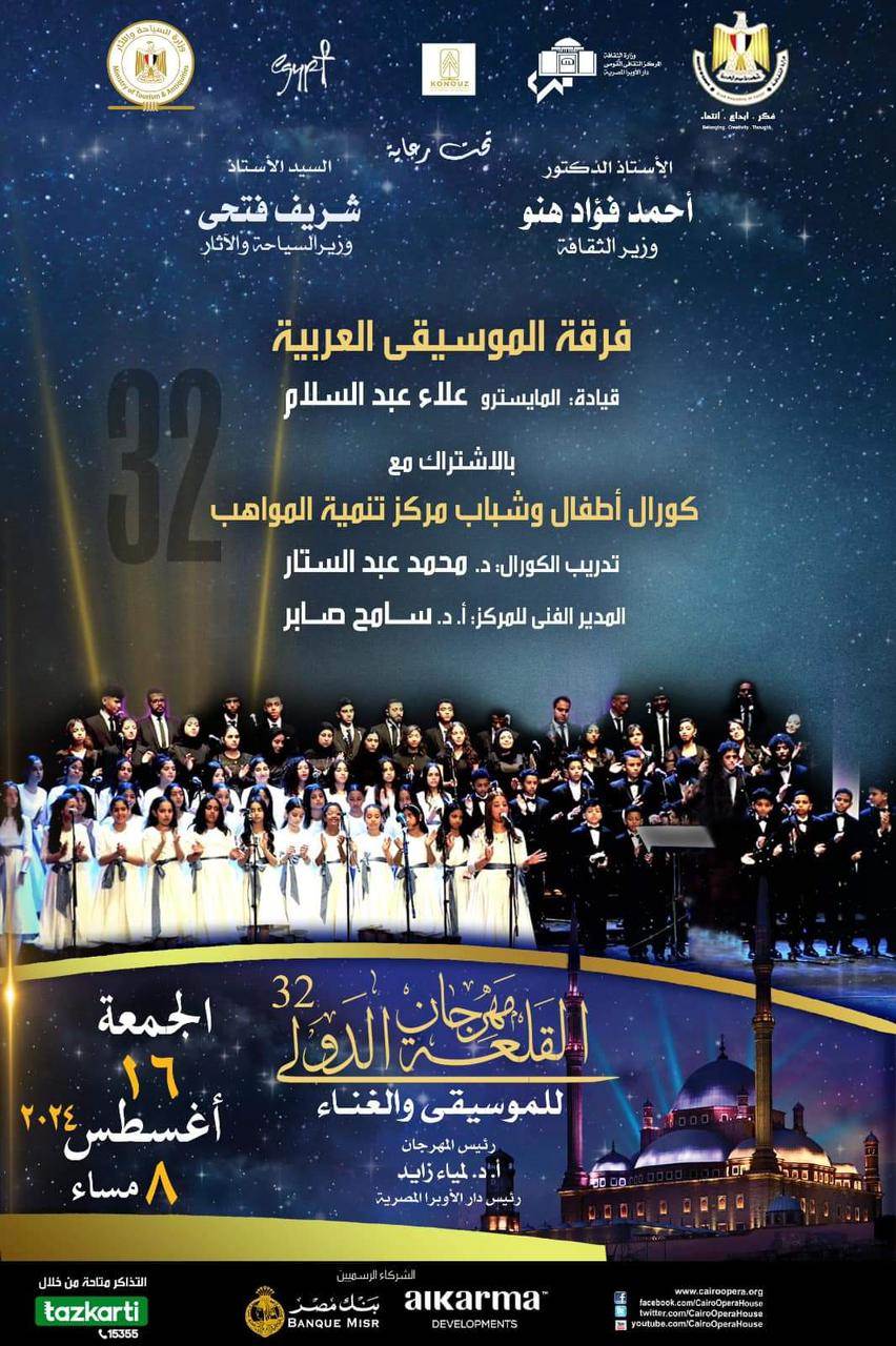 ضمن خطة نشاط وزارة الثقافة، وتحت رعاية الدكتور أحمد فؤاد هنو وزير الثقافة تقام فعاليات الليلة الثانية من مهرجان القلعة الدولي للموسيقى والغناء في دورته الثانية والثلاثين، والذي تنظمه دار الأوبرا المصرية برئاسة الدكتورة لمياء زايد،حيث تستعد أجواء مسرح المحكى لاستقبال حفلين غنائيين بقيادة المايسترو الدكتور علاء عبد السلام يوم الجمعة الموافق ١٦ أغسطس 2024.