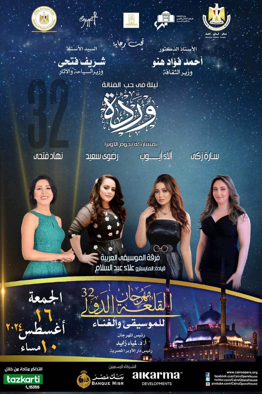 أما في العاشرة مساءً، تنطلق فرقة الموسيقى العربية فى رحلة من الطرب الأصيل تحت عنوان "ليلة في حب الفنانة وردة"، تعيد خلالها إحياء أشهر أغانيها منها "مالى، أكدب عليك، العيون السود، لولا الملامة، بتونس بيك، اسمعونى، بلاش تفارق، قلبى سعيد، حلوة بلادي السمرا"، ويشارك في إحياء هذه الليلة كل من ألاء أيوب، رضوى سعيد، سارة زكى، ونهاد فتحي".