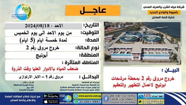 منوهة الشركة أن أعمال التطهير هذه ينتج عنه ضعف المياه بالأدوار العليا وقت الذروة مع توفير البدائل المروق رقم ١ والابار الارتوازى ولذا ترجو الشركة من السادة العملاء توفير كافة تدابيرهم من المياه اللازمة لقضاء حوائجهم خلال فترة الانقطاع او الضعف ، وتعلم الشركة أن جميع قنوات التواصل من خط الساخن 125 من أى تليفون أرضى، أو من أي محمول 01280733990، أو على رقم 01285000125 والواتس01206179891، أو الصفحة الرسمية للشركة أو موقعها أو موقعها الرسمي والمتاح على http://ascww.org/public/ والموبيل أبليكيشن، وبرامج الــCMS لاستقبال الشكاوى الالكترونية على أتم الاستعداد لتلقى أي شكوى أو أي احتياج لسيارات مياه.