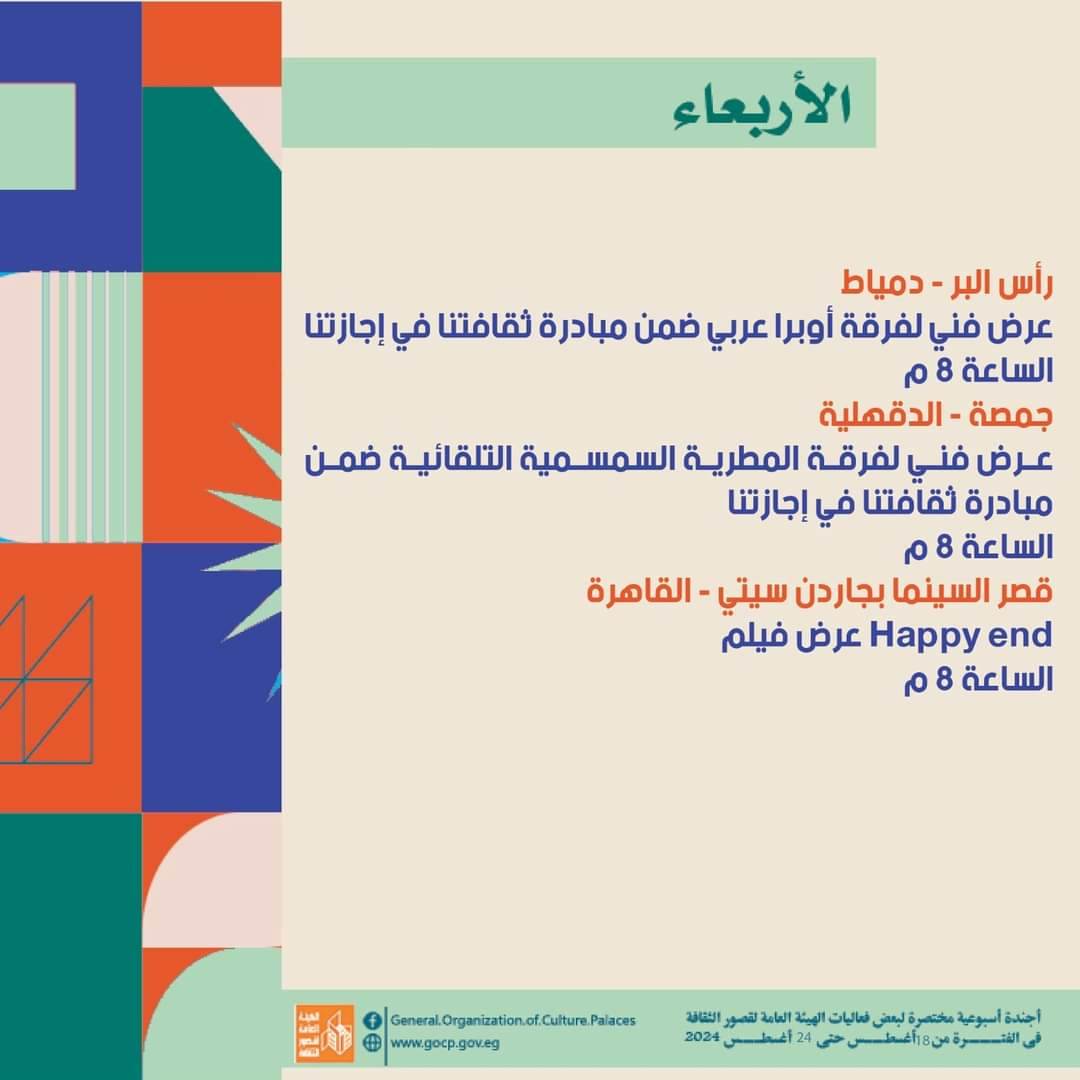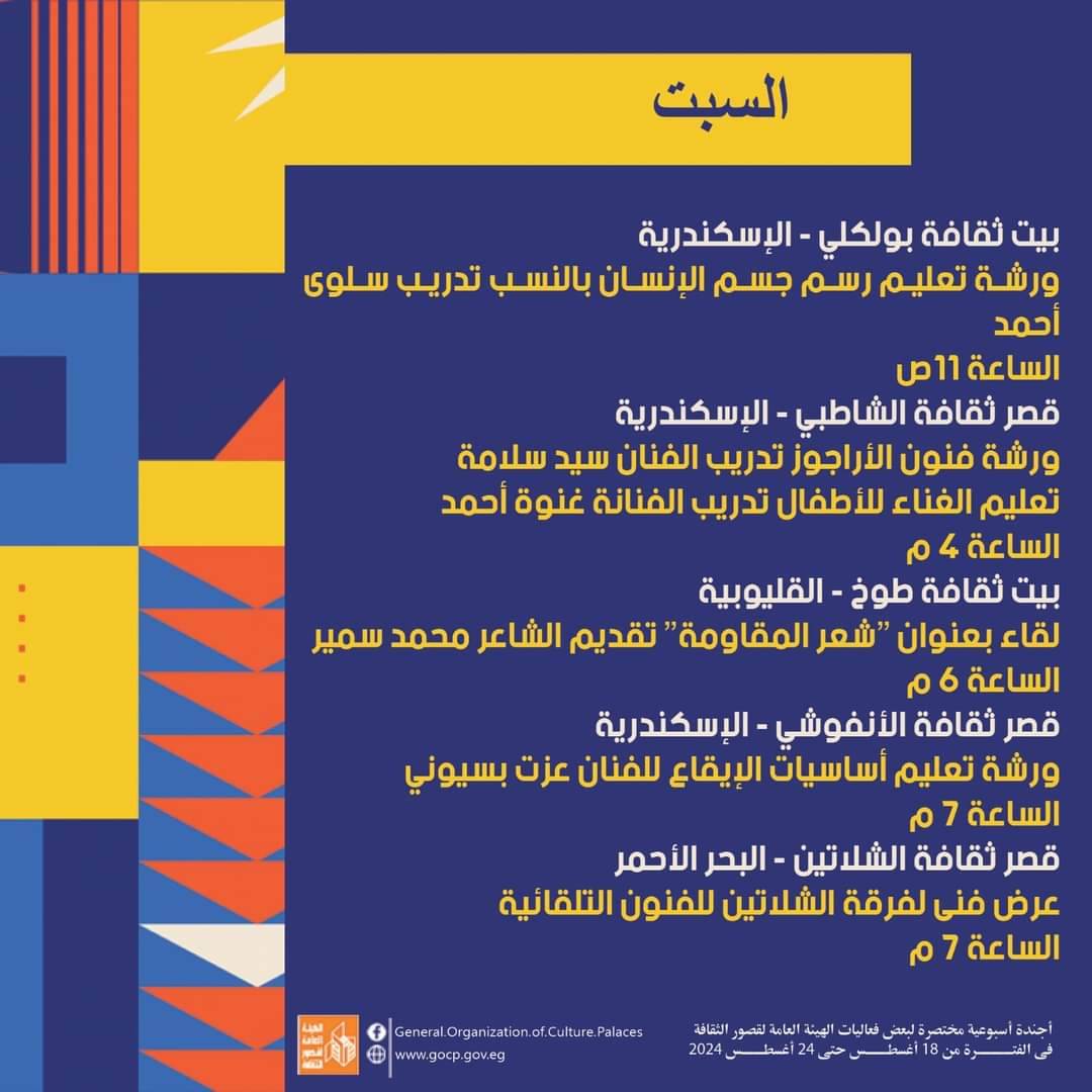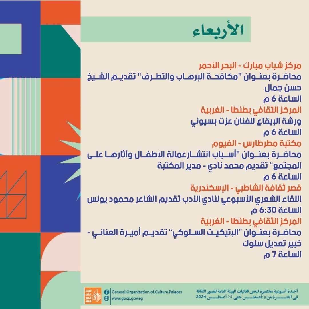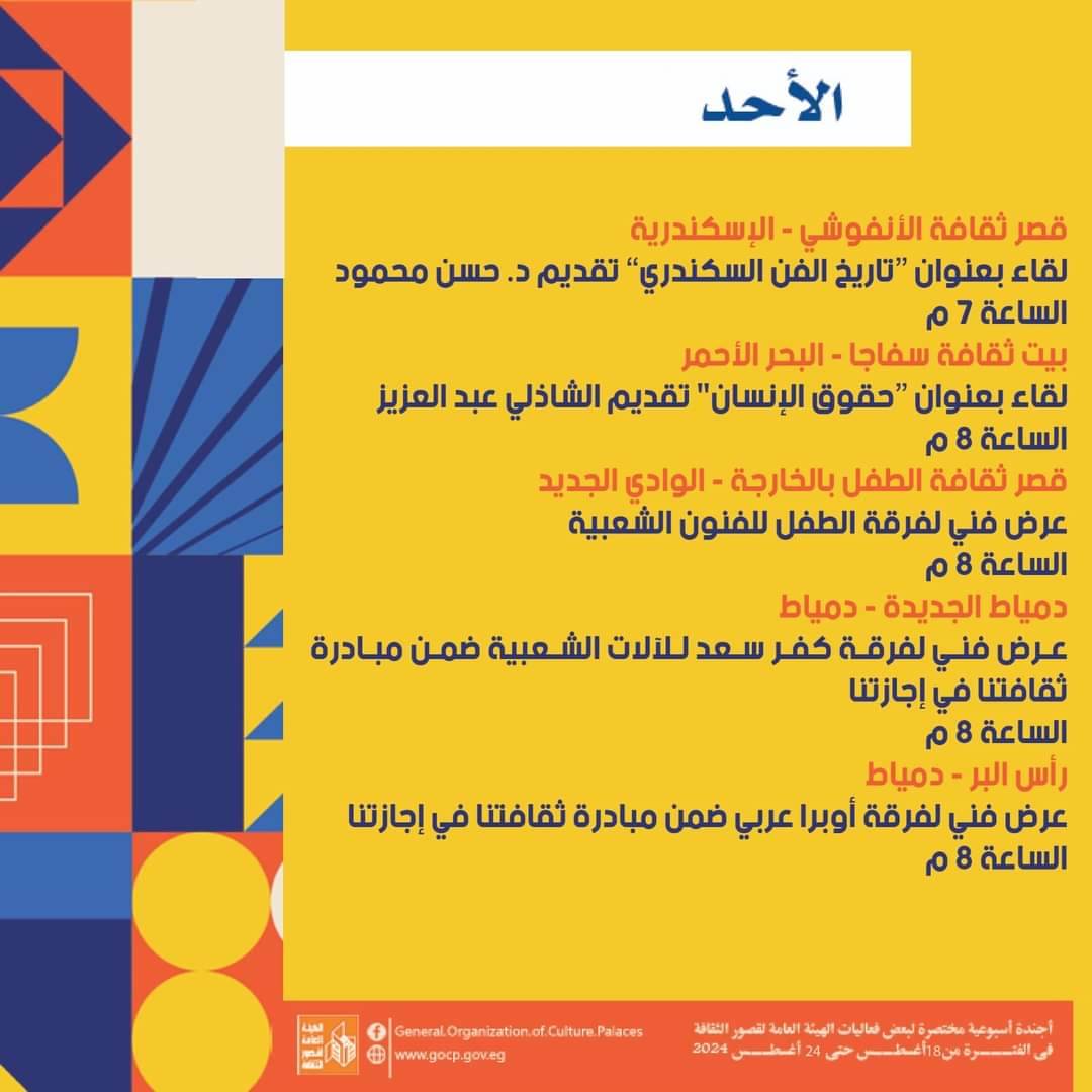 ضمن برامج وزارة الثقافة، وبرعاية الدكتور أحمد فؤاد هنو، وزير الثقافة، تقدم الهيئة العامة لقصور الثقافة، بإشراف الكاتب محمد عبد الحافظ ناصف، نائب رئيس الهيئة، أجندة حافلة بالفعاليات الفنية والأدبية، بدءا من اليوم الأحد وحتى السبت المقبل 24 أغسطس.