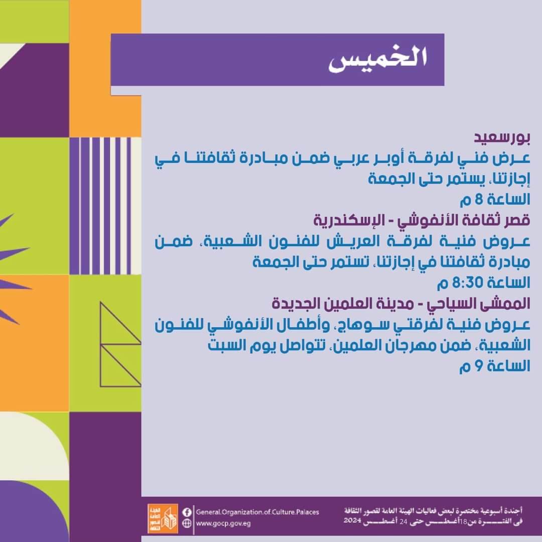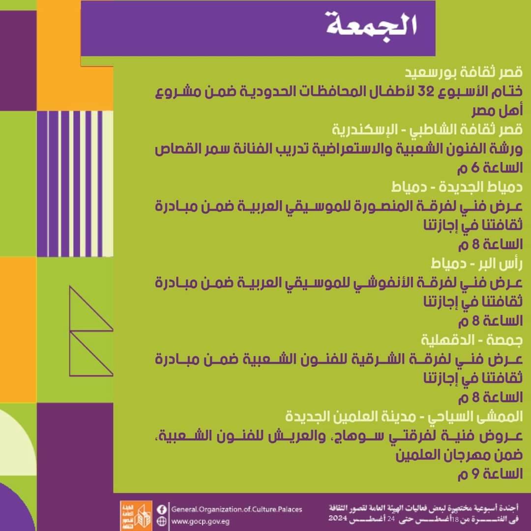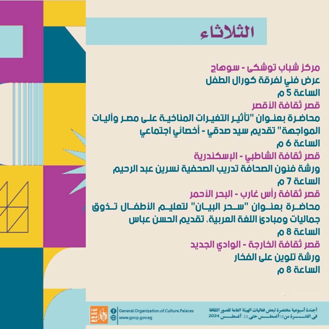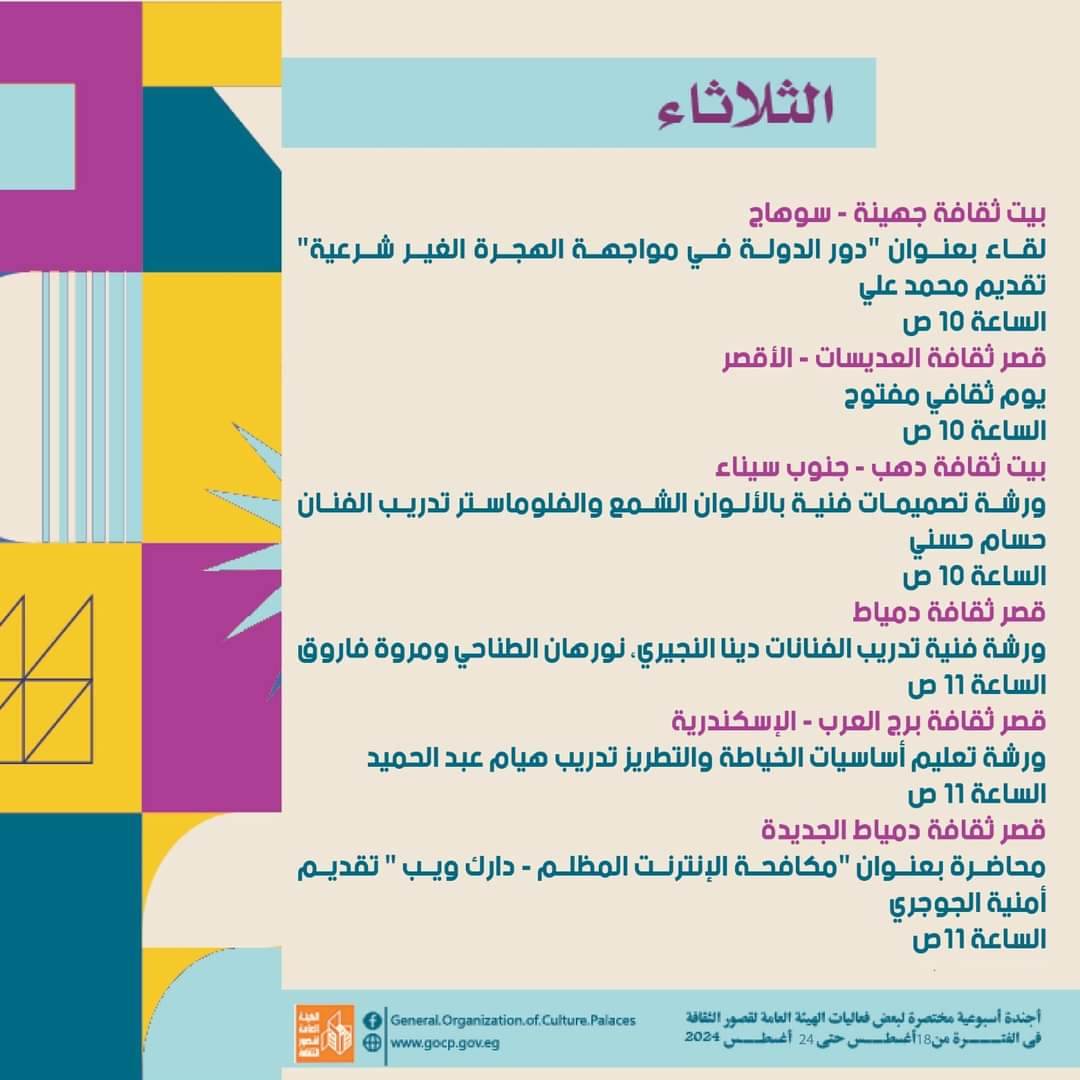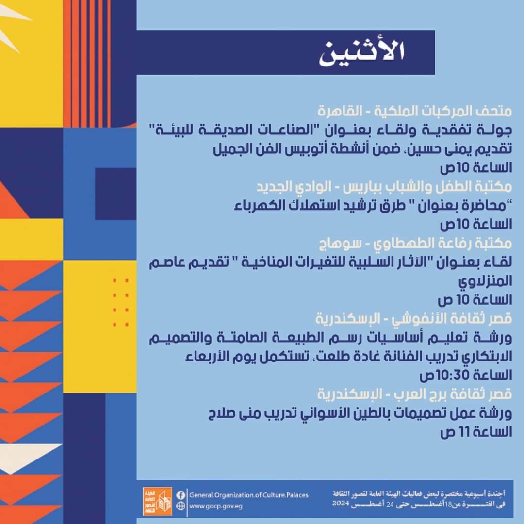 ضمن برامج وزارة الثقافة، وبرعاية الدكتور أحمد فؤاد هنو، وزير الثقافة، تقدم الهيئة العامة لقصور الثقافة، بإشراف الكاتب محمد عبد الحافظ ناصف، نائب رئيس الهيئة، أجندة حافلة بالفعاليات الفنية والأدبية، بدءا من اليوم الأحد وحتى السبت المقبل 24 أغسطس.