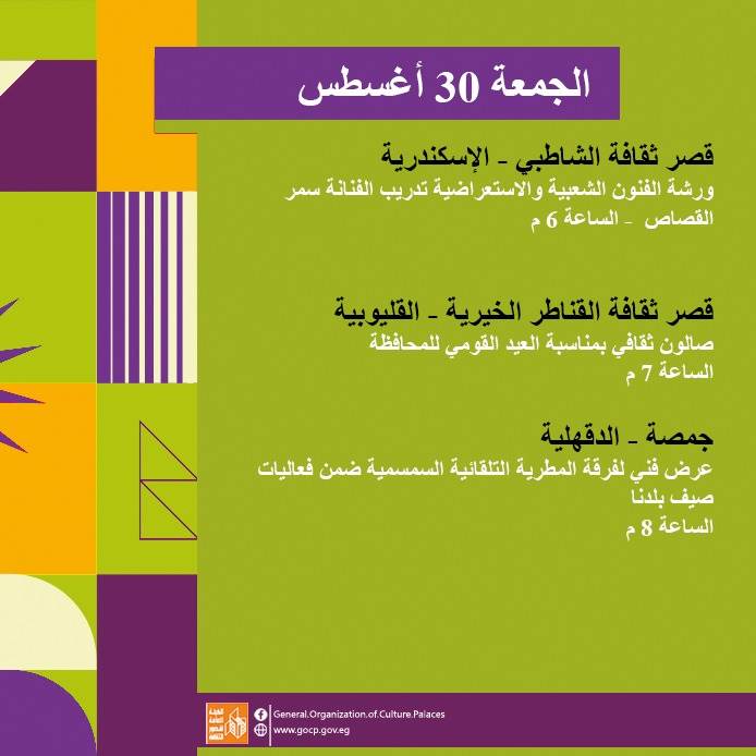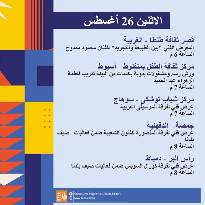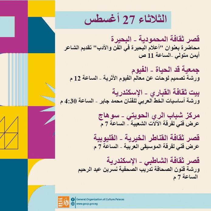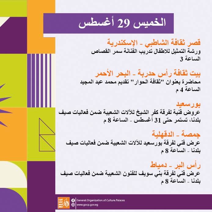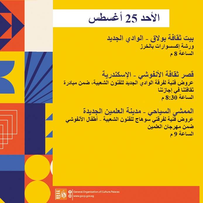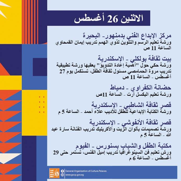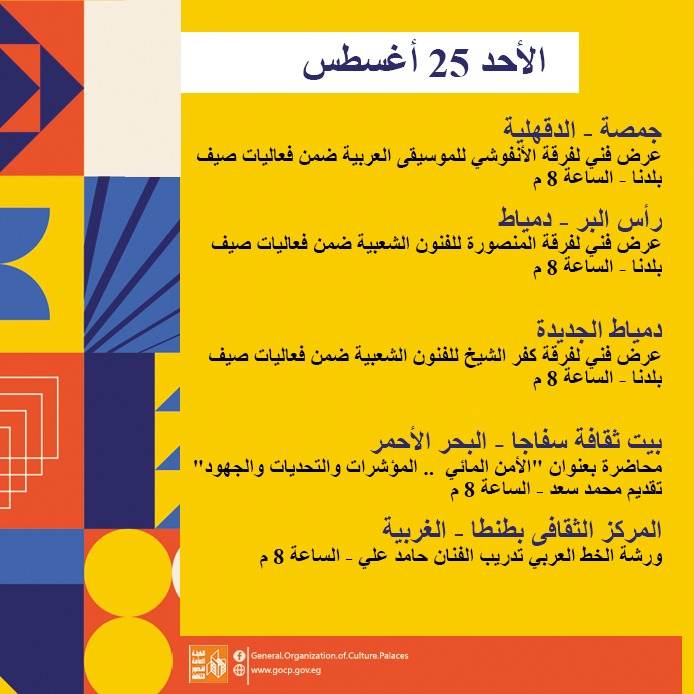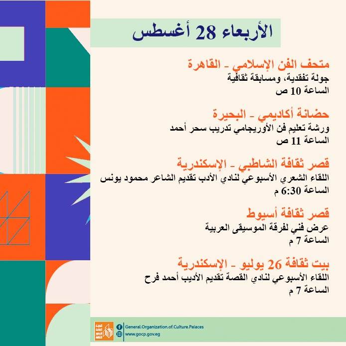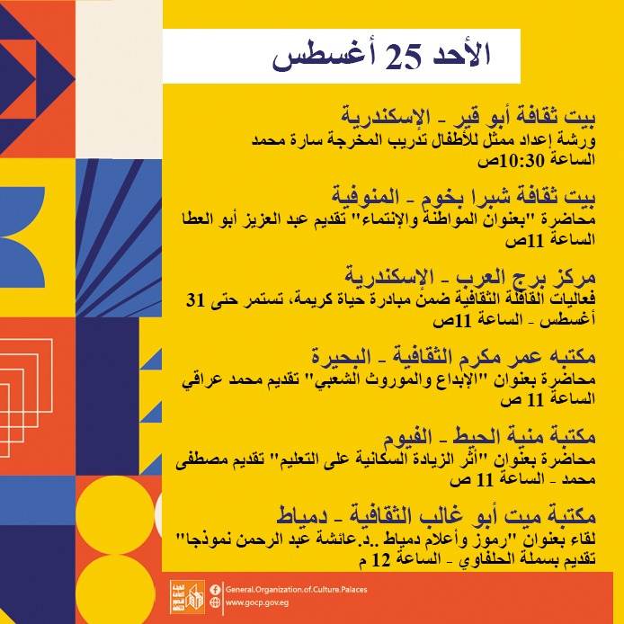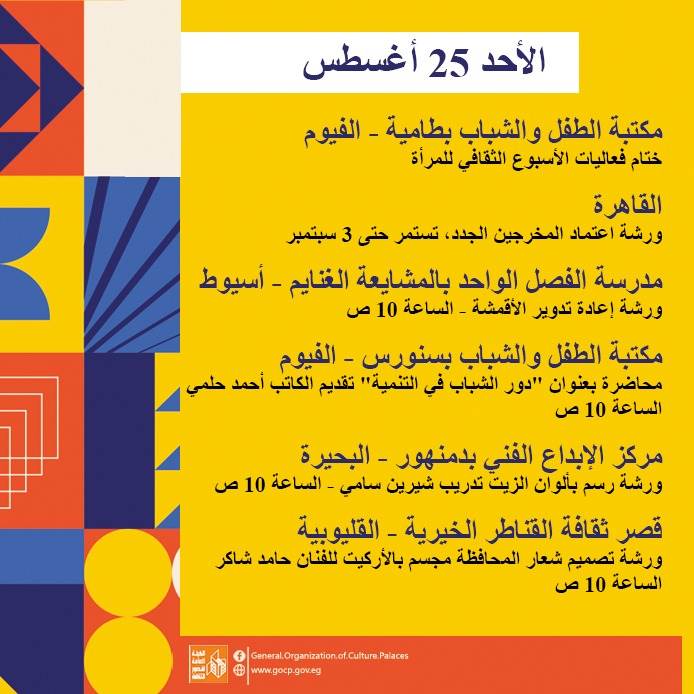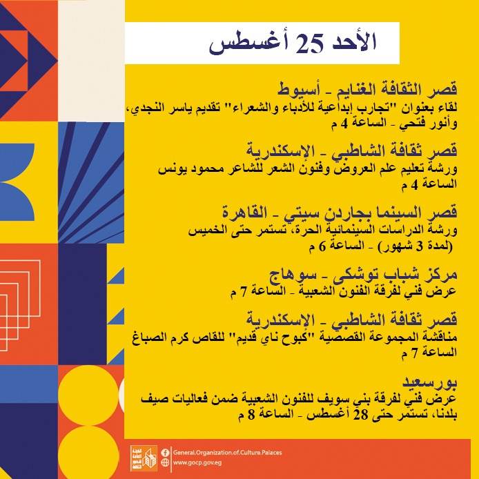 كما تحفل الأجندة بعدد من اللقاءات التثقيفية والأدبية بمشاركة نخبة من الأدباء والمفكرين، هذا بالإضافة إلى استمرار الحفلات الصيفية بالمحافظات، والورش الفنية ضمن أنشطة مبادرة "ثقافتنا في إجازتنا" ومنها: تعليم فن البكسل آرت، السينوغرافيا، مبادئ التمثيل، الخط العربي، الكتابة الصحفية، وإعادة التدوير وغيرها.