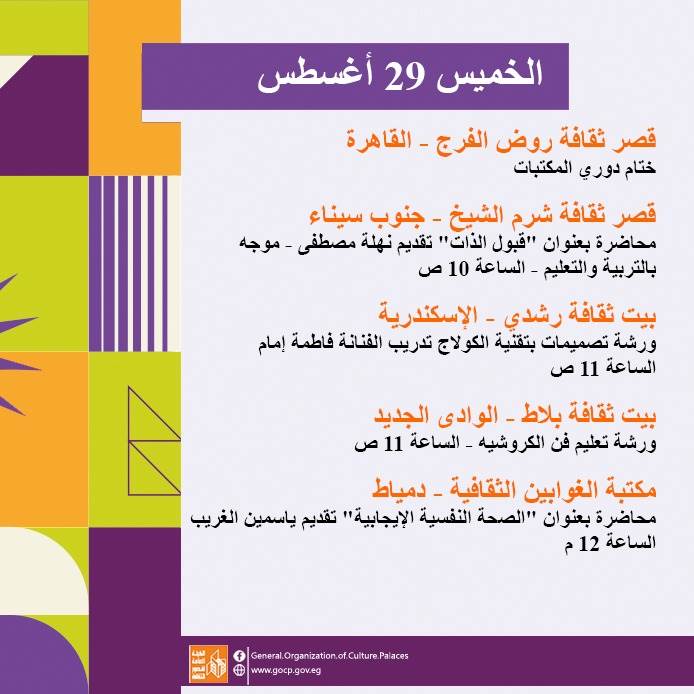 ويوم الخميس المقبل، يستقبل قصر ثقافة روض الفرج، ختام فعاليات برنامج "دوري المكتبات"، لرواد المواقع الثقافية بالمحافظات.