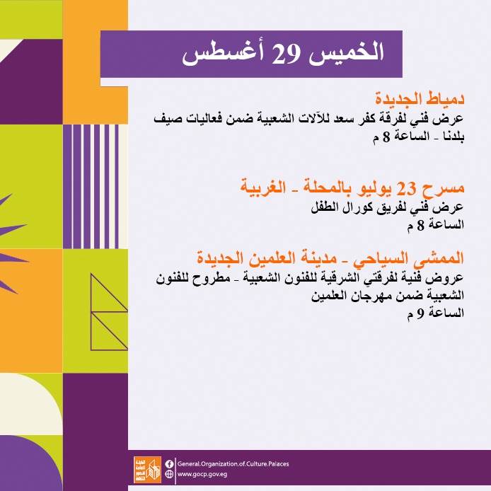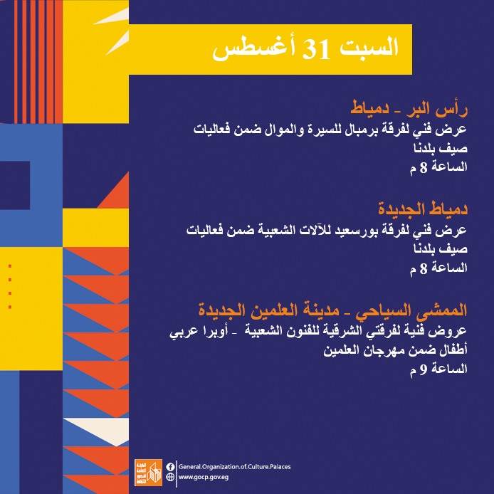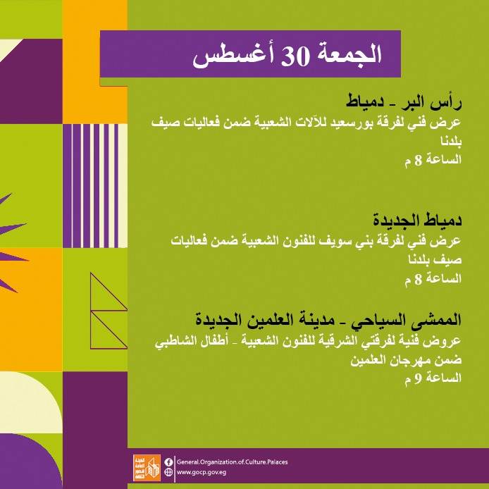 وخلال الأسبوع الأخير من مهرجان "العالم علمين" في نسخته الثانية، تقدم هيئة قصور الثقافة باقة من العروض الفنية المتميزة والمستوحاة من فلكلور الصعيد وبحري ومحافظات شرق الدلتا.
