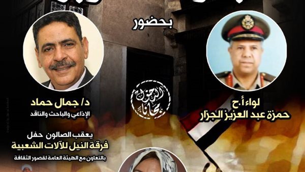 في إطار احتفال وزارة الثقافة بانتصارات أكتوبر المجيدة.. يقيم مركز إبداع بيت السحيمي بشارع المعز، بالتعاون مع مركز طلعت حرب الثقافي، التابعان لقطاع صندوق التنمية الثقافية برئاسة المعماري حمدي السطوحي، ندوة جديدة بعنوان "بطولات أكتوبر"، وذلك في الساعة السابعة مساء الأحد ١٣ أكتوبر. بحضور كل من اللواء أ.ح حمزة عبد العزيز الجزار والباحث والناقد د. جمال حماد .. تدير الحوار الأستاذة منال نور الدين، الكاتبة الصحفية بالأهرام.