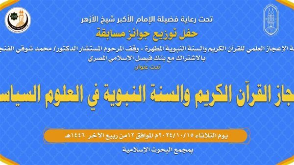 تعقد لجنة الإعجاز العلمى للقرآن الكريم والسنة النبوية المطهرة بمجمع البحوث الإسلامية، غدا الثلاثاء حفلا لتكريم الفائزين بالمسابقة العالمية التي نظمتها اللجنة لعام 2023ــ2024م، والتي عقدت هذا العام فى موضوع: (إعجاز القرآن الكريم والسنة فى العلوم السياسية) ، وذلك فى إطار توجيهات فضيلة الإمام الأكبر أ.د. أحمد الطيب – شيخ الأزهر بعقد المسابقات التي تثرى الجوانب العلمية والفكرية وتشجع على القراءة والبحث؛ حيث تؤدى هذه المسابقات دورا مهما فى تشجيع الباحثين على القراءة والاطلاع وإثراء معارفهم المختلفة.