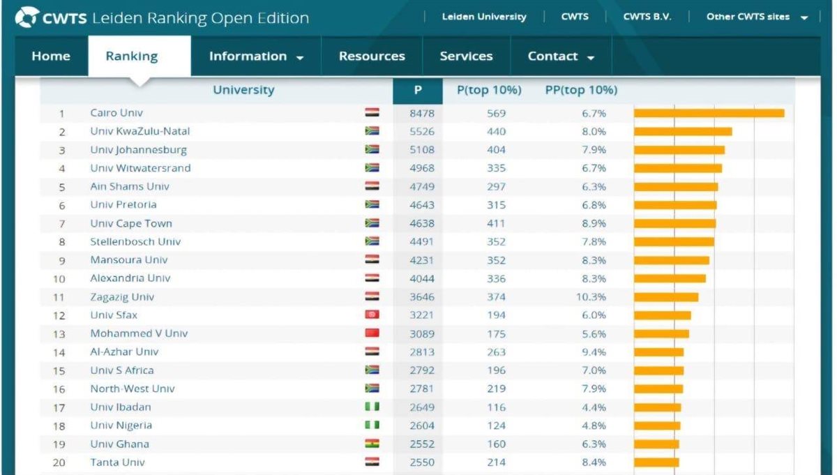 حققت جامعة القاهرة برئاسة د. محمد سامي عبد الصادق رئيس الجامعة إنجازًا عالميًا جديدًا بتواجدها ضمن أفضل 200 جامعة على مستوى العالم بحصولها على المركز 164 من بين جامعات العالم التي خضعت لتصنيف "ليدن" الهولندي - إصدار أكتوبر 2024، حيث تصدرت جميع الجامعات الأفريقية والمصرية في التصنيف، وجاءت بعدها جامعات عين شمس (400) والمنصورة (454) والإسكندرية (481) والزقازيق (533) والأزهر (695) وطنطا (764) وأسيوط (765) والمنوفية (920) وبنها (1033) وبني سويف (1081) والمنيا (1123) وحلوان (1236) وقناة السويس (1248) وكفر الشيخ .(1387)