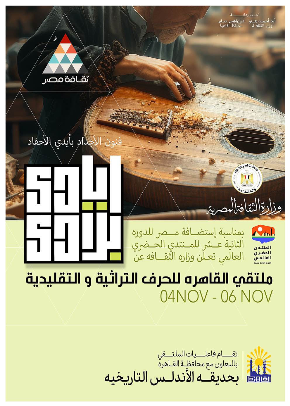 تنظم وزارة الثقافة، بالتعاون مع محافظة القاهرة، خلال الفترة من 4 إلى 8 نوفمبر 2024، ملتقى "أيادي بلادي" للحرف التراثية والتقليدية، بحديقة الأندلس، تزامناً مع استضافة مصر للدورة الثانية عشرة للمنتدى الحضري العالمي، يهدف هذا الملتقى إلى إحياء التراث المصري ودعمه، ومنح الحرفيين الفرصة لعرض أعمالهم وإبداعاتهم.