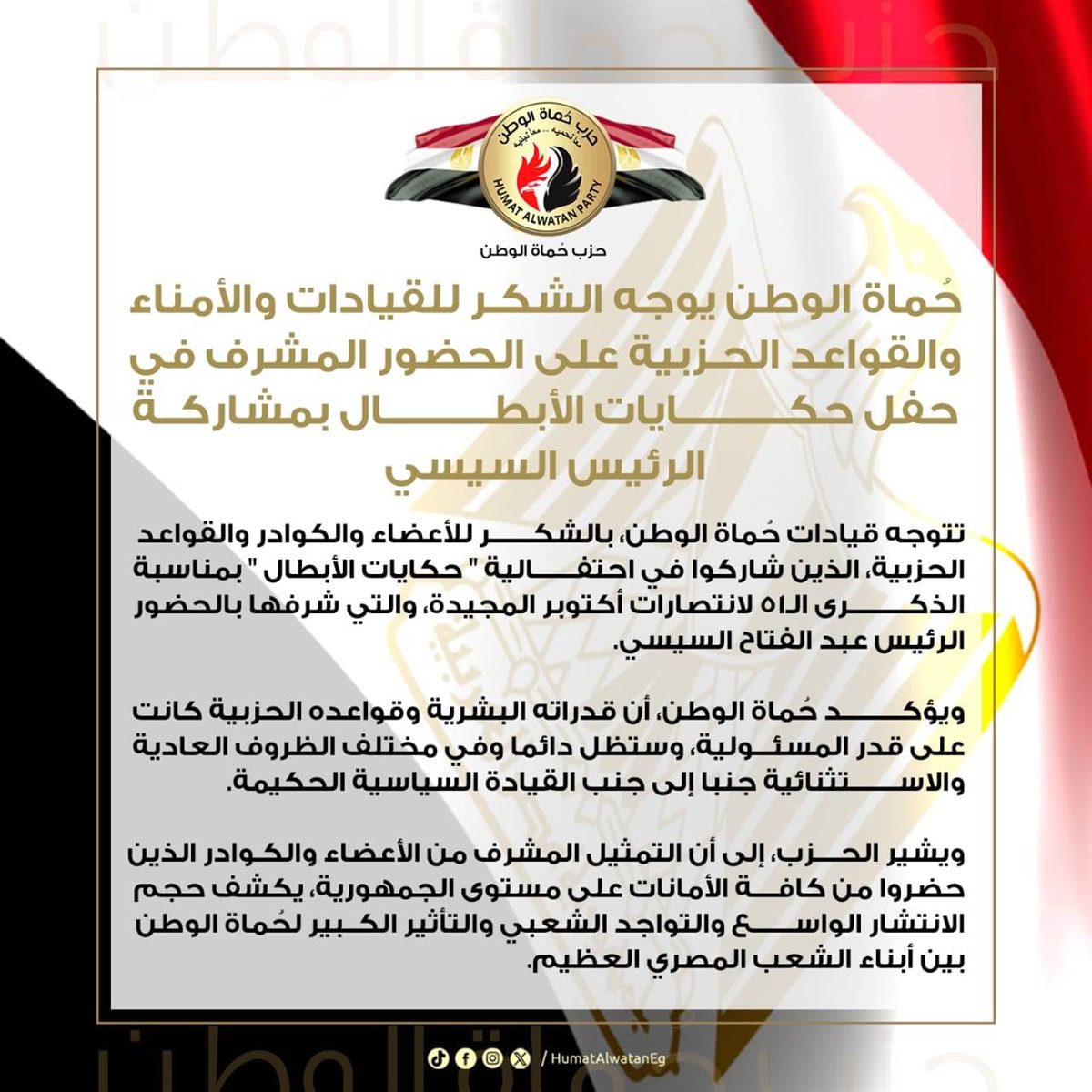 توجهت قيادات حماة الوطن، بالشكر للأعضاء والكوادر والقواعد الحزبية، الذين شاركوا في احتفالية "حكايات الأبطال" بمناسبة الذكرى الـ51 لانتصارات أكتوبر المجيدة، والتي شرفها بالحضور الرئيس عبدالفتاح السيسي.