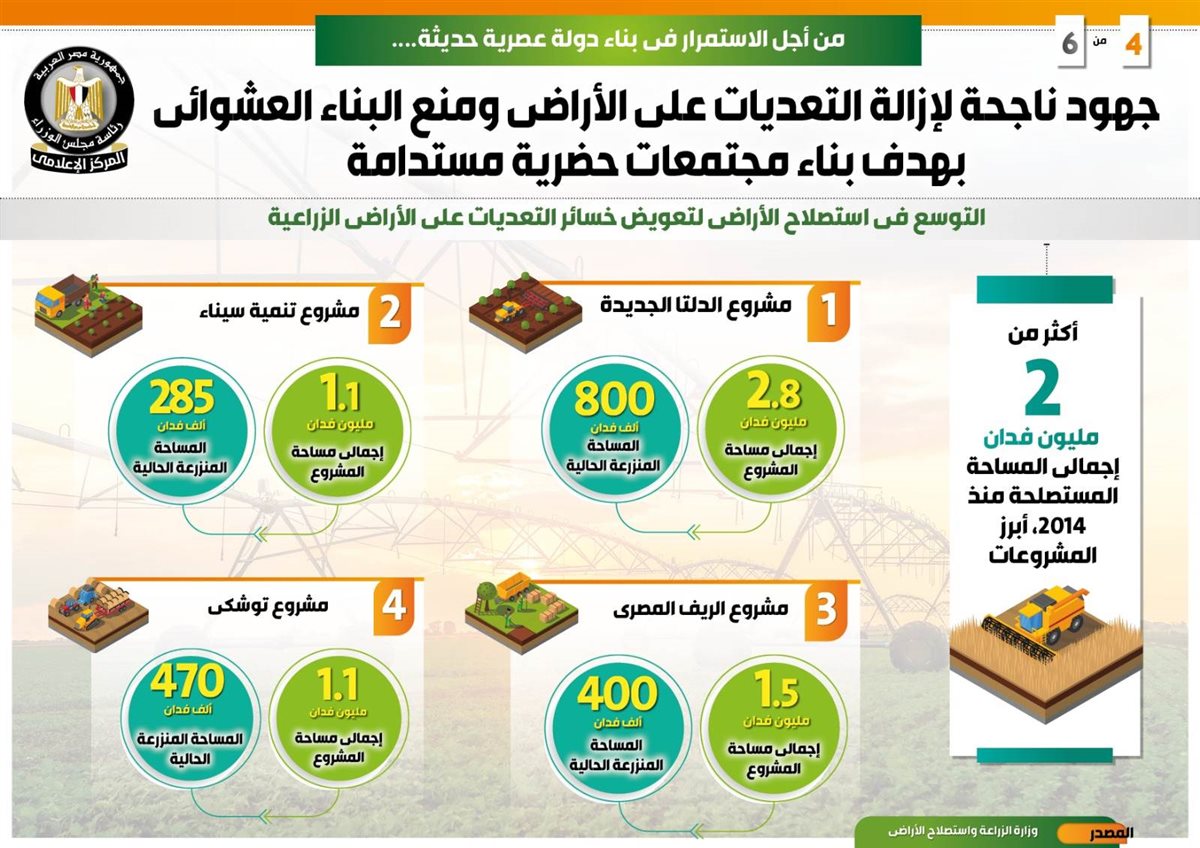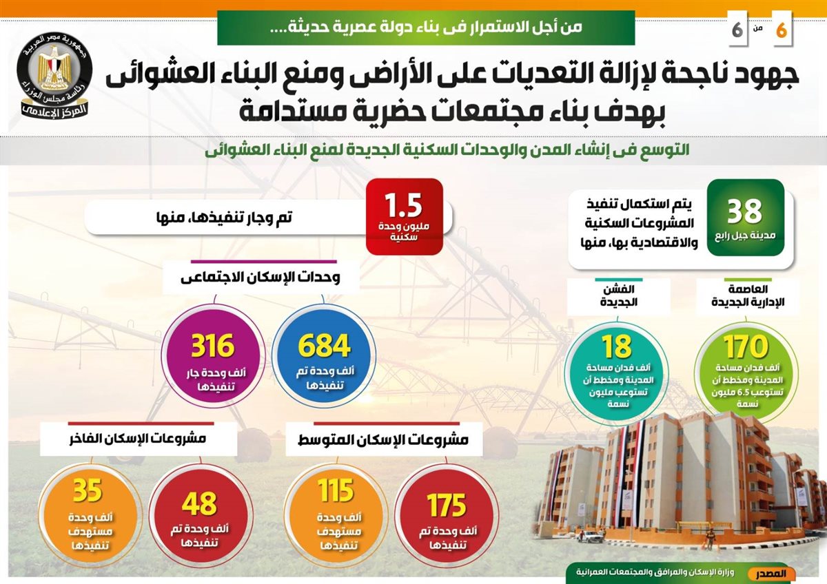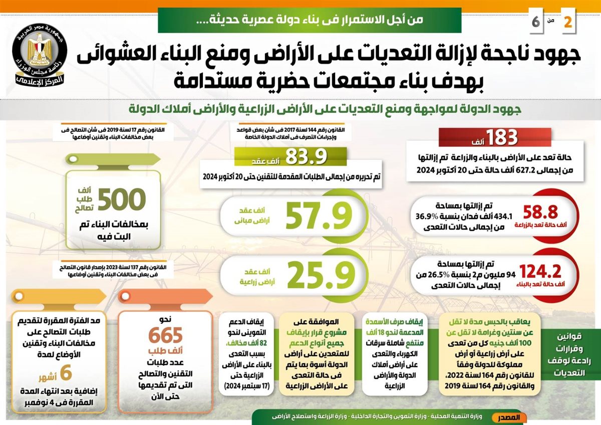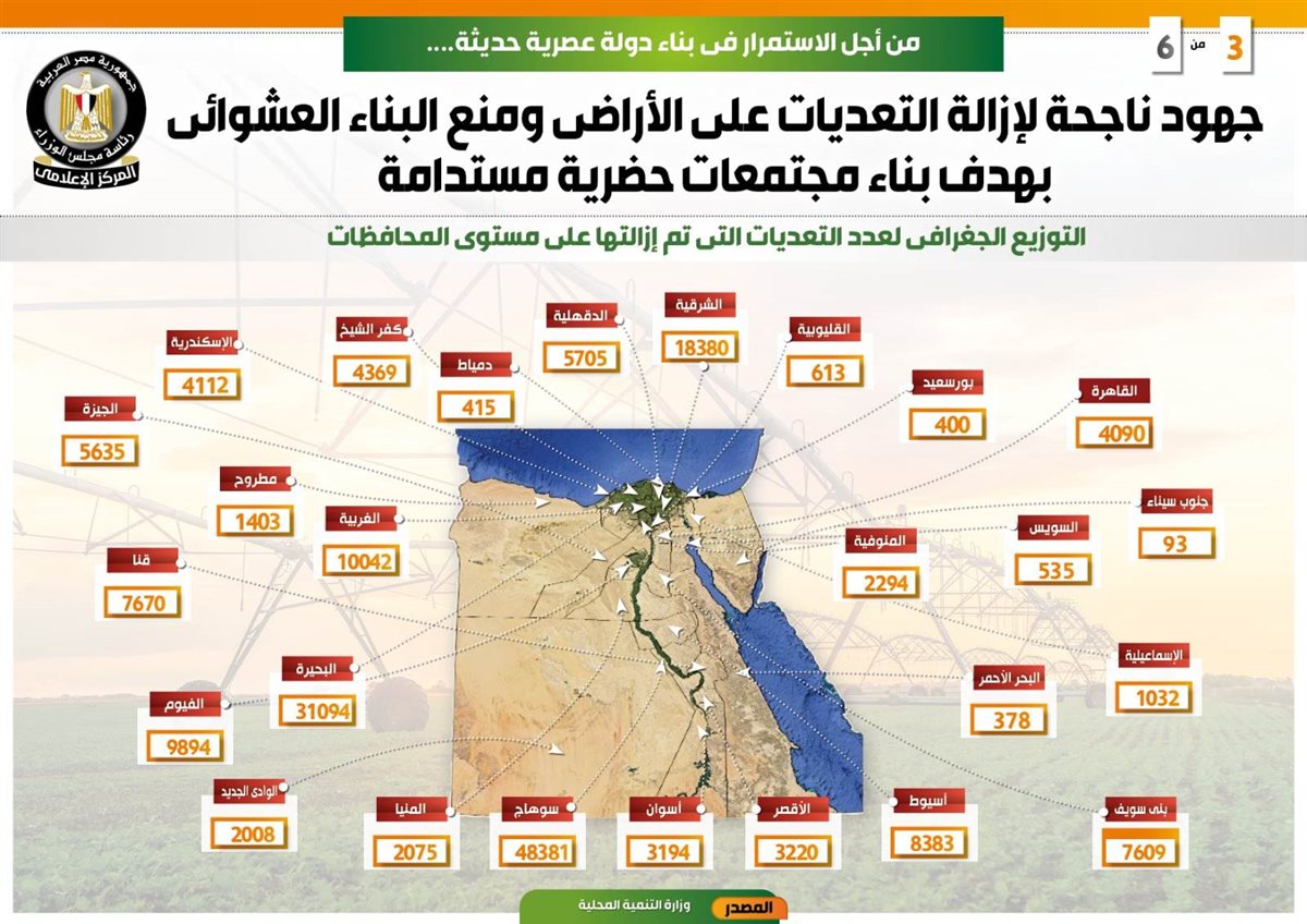 وفي هذا الصدد نشر المركز الإعلامي لمجلس الوزراء تقريراً تضمن إنفوجرافات تسلط الضوء على الجهود الناجحة للدولة لإزالة التعديات على الأراضي ومنع البناء العشوائي بهدف بناء مجتمعات حضرية مستدامة من أجل الاستمرار في بناء دولة عصرية حديثة.