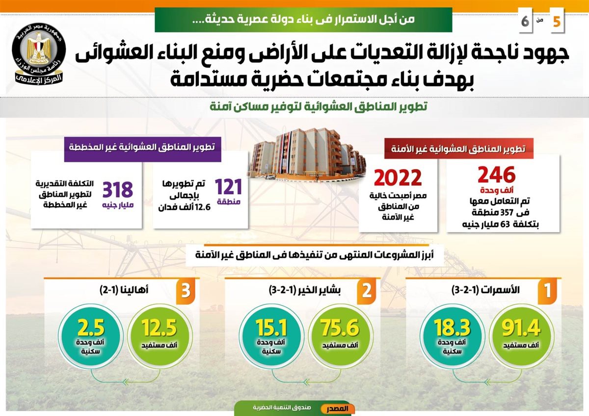 أما عن أبرز المشروعات التي تم الانتهاء من تنفيذها في المناطق غير الآمنة، فتتضمن بشاير الخير (1-2-3) وقد بلغ عدد المستفيدين منها 75.6 ألف مستفيد، بعدد 15.1 ألف وحدة سكنية، فضلاً عن الأسمرات (1-2-3)، وقد بلغ عدد المستفيدين 91.4 ألف مستفيد، بعدد وحدات سكنية 18.3 ألف وحدة، فيما بلغ عدد المستفيدين من مشروع أهالينا (1-2) 12.5 ألف مستفيد، بعدد 2.5 ألف وحدة سكنية.