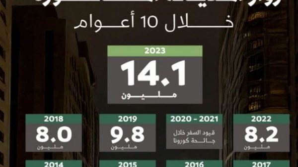 وذكرت الإحصائية عدد قاصدي المدينة المنورة من عام 2014م إلى عام 2023م ، إذ بلغ عدد الزائرين في عام 2014م 6.3 مليون زائر، وشهد العام 2015م العدد ذاته، فيما تجاوز عدد الزائرين 6.5 مليون خلال العام 2016م، أما عام 2017م فقد بلغ عدد الزائرين 7.5 مليون، فيما وصل عدد الزائرين خلال العام 2018م 8 ملايين زائر، وعام 2019م 9.8 مليون زائر، وفيما يخص عام 2020م-2021م فقد شهد جائحة كرونا، والتي جرى خلالها فرض قيود على حركة المسافرين، ثم عاد النشاط السياحي للمدينة المنورة خلال العام 2022م ليحقق أكثر من 8 ملايين زائر، فيما شهد العام 2023 قفزةً تاريخيّة ً بالنسبة للأعوام العشر السابقة، إذ بلغ عدد القاصدين للمدينة المنورة 14.1 مليون زائر.
