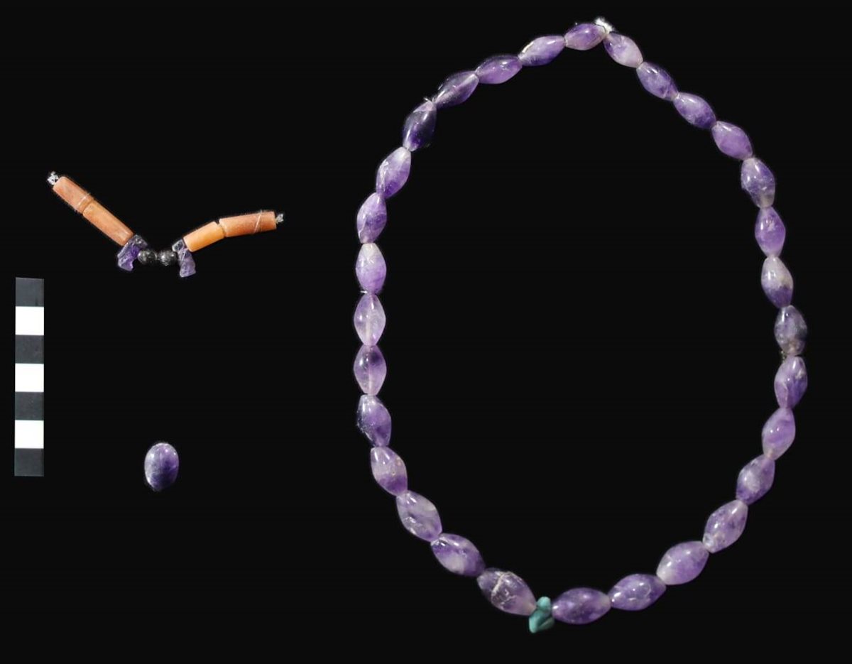 وأوضح الدكتور هشام الليثي رئيس قطاع حفظ وتسجيل الآثار المصرية بالمجلس الأعلى للآثار، إنه من أبرز المكتشفات الأثرية قلادة فريدة مكونة من 30 خرزة أسطوانية الشكل من حجر الأماتيست مع خرزتين أسطوانيتين من العقيق يحيطان بتميمة على شكل رأس فرس النهر، بالإضافة إلى مجموعة من القلادات والأساور والسلاسل والخواتم والأحزمة المصنوعة من العقيق الأحمر والخزف المطعم باللون الأزرق والأخضر وحجر الفاينس المطلي كما زينت بتمائم على شكل رؤوس أفراس النهر والصقور وتمائم علي هيئة رأس ثعبان وغيرها وجميعها في حالة جيدة من الحفظ.