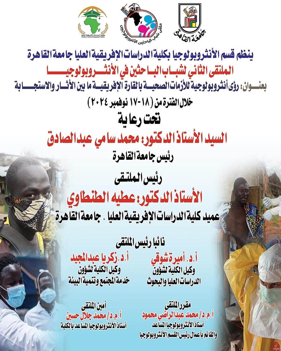 في إطار دعم البحث العلمي والتفاعل مع التحديات الصحية التي تواجه القارة الأفريقية، ينظم قسم الأنثروبولوجيا بكلية الدراسات الأفريقية العليا بجامعة القاهرة "الملتقى الثاني لشباب الباحثين الأنثروبولوجيين" تحت عنوان "رؤى أنثروبولوجية للأزمات الصحية بالقارة الأفريقية ما بين الآثار والاستجابة".