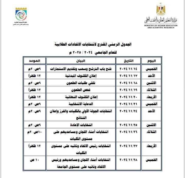 الجدول الزمني لانتخابات الاتحادات الطلابية بالجامعات للعام الدراسي 2024/2025