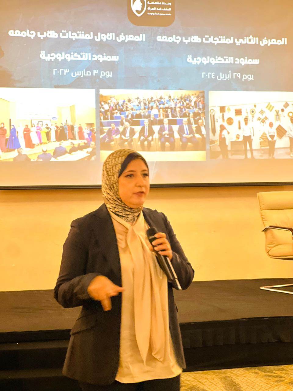 وخلال الملتقى، قدمت الدكتورة هبه الفوطي، مدرس بقسم تكنولوجيا صيانة وتشغيل ماكينات الغزل والنسيج بكلية تكنولوجيا الصناعة والطاقة بجامعة سمنود، عرضًا، تناول أبرز جهودها في مناهضة العنف ضد المرأة، بما في ذلك تنظيم ورش العمل التوعوية، وإطلاق برامج دعم نفسي وقانوني للناجيات، وتطوير آليات للإبلاغ عن حالات العنف باستخدام التكنولوجيا.