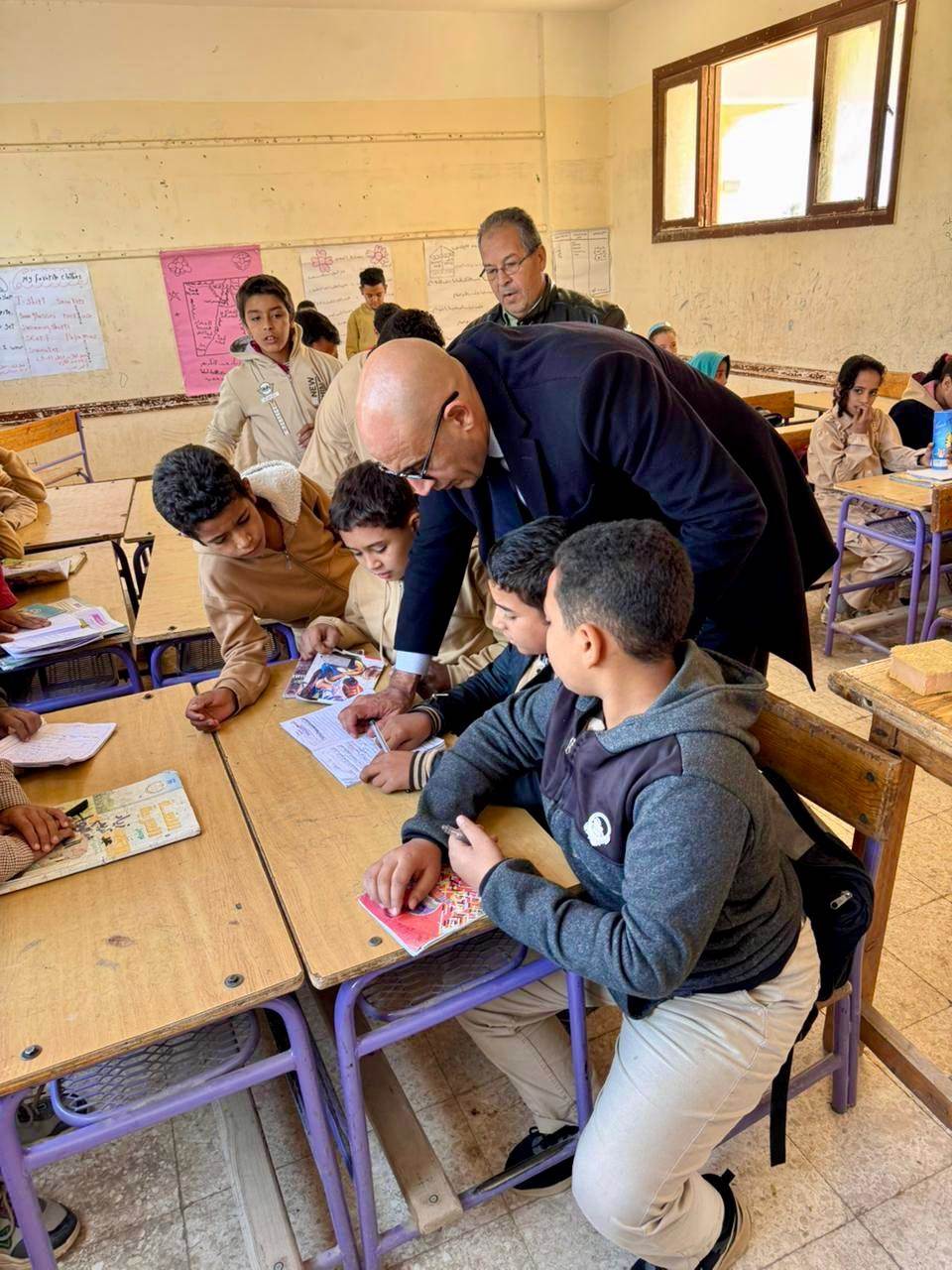 ثم توجه الوزير إلى مدرسة "معصرة أبو صير الجديدة الابتدائية"، التي يبلغ عدد طلابها ٢٩٨ طالبًا، حيث حرص خلال تفقده المدرسة على متابعة نسب حضور الطلاب، ومراجعة دفاتر تسجيل درجات الطلاب في التقييمات الأسبوعية؛ للاطمئنان على مستوى التحصيل الدراسي.