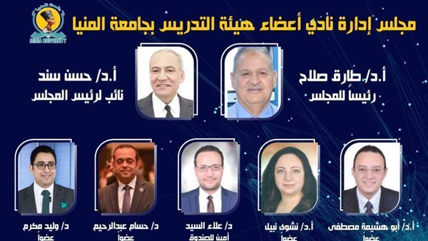 أعلن الدكتور عصام فرحات رئيس جامعة المنيا صدور قرار الدكتور أشرف صبحي وزير الشباب والرياضة بتشكيل مجلس إدارة نادي هيئة التدريس بالجامعة برئاسة الدكتور طارق محمد صلاح عميد كلية التربية الرياضية السابق والدكتور حسن سعد سند نائباً للرئيس والدكتور علاء أحمد السيد أميناً للصندوق وعضوية كل من الدكتور أبو هشيمة مصطفى السيد والدكتورة نشوى نبيل والدكتور حسام محمد عبد الرحيم والدكتور وليد مكرم محمد.