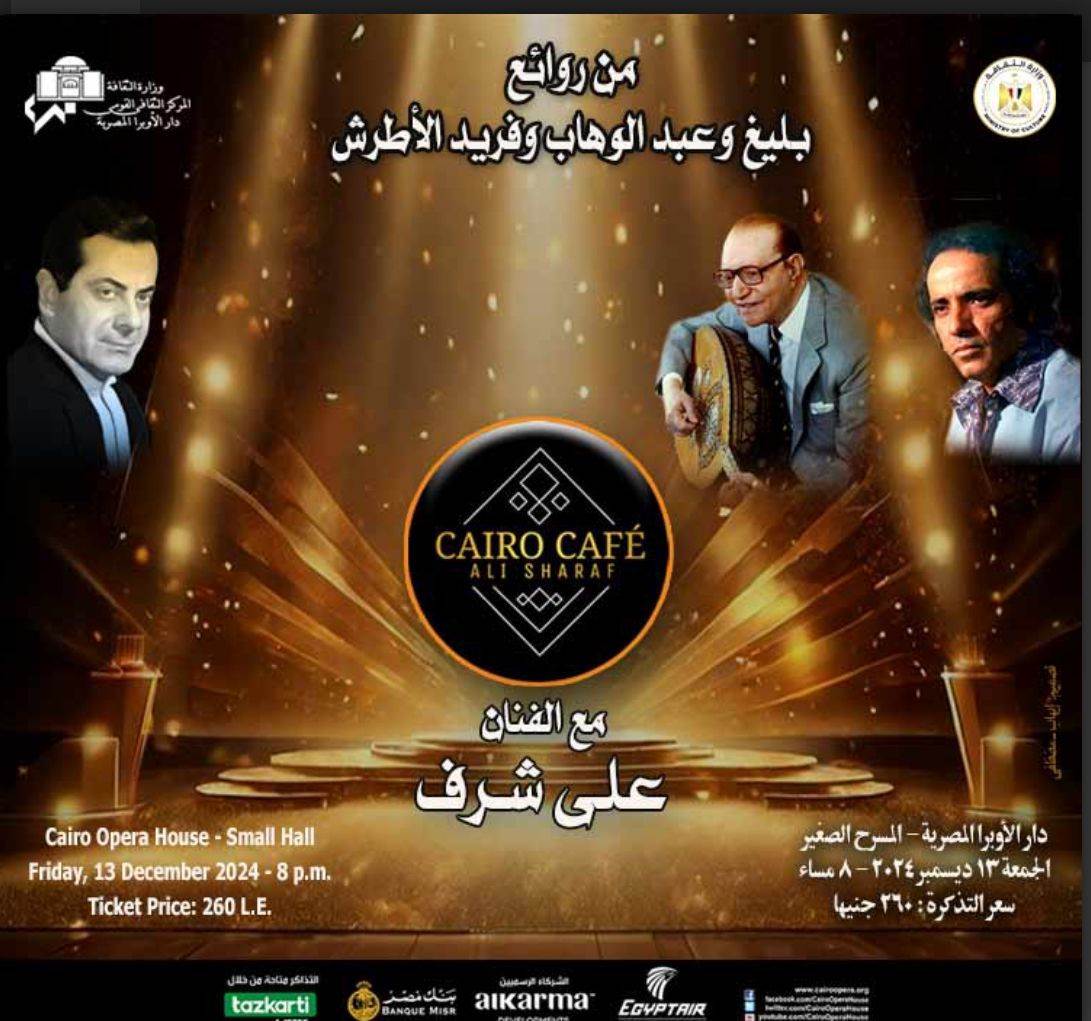 استمرارا لأنشطة وزارة الثقافة الهادفة لعرض وتقديم الألوان الفنية المميزة تقيم دار الأوبرا المصرية برئاسة الدكتورة لمياء زايد حفلاً لفرقة كايرو كافيه يقيادة عازف البيانو والموزع الموسيقى على شرف ومشاركة المغنيتين ليديا وأمنية وعازف القانون على محمود وذلك في الثامنة مساء الجمعة ١٣ ديسمبر على المسرح الصغير .