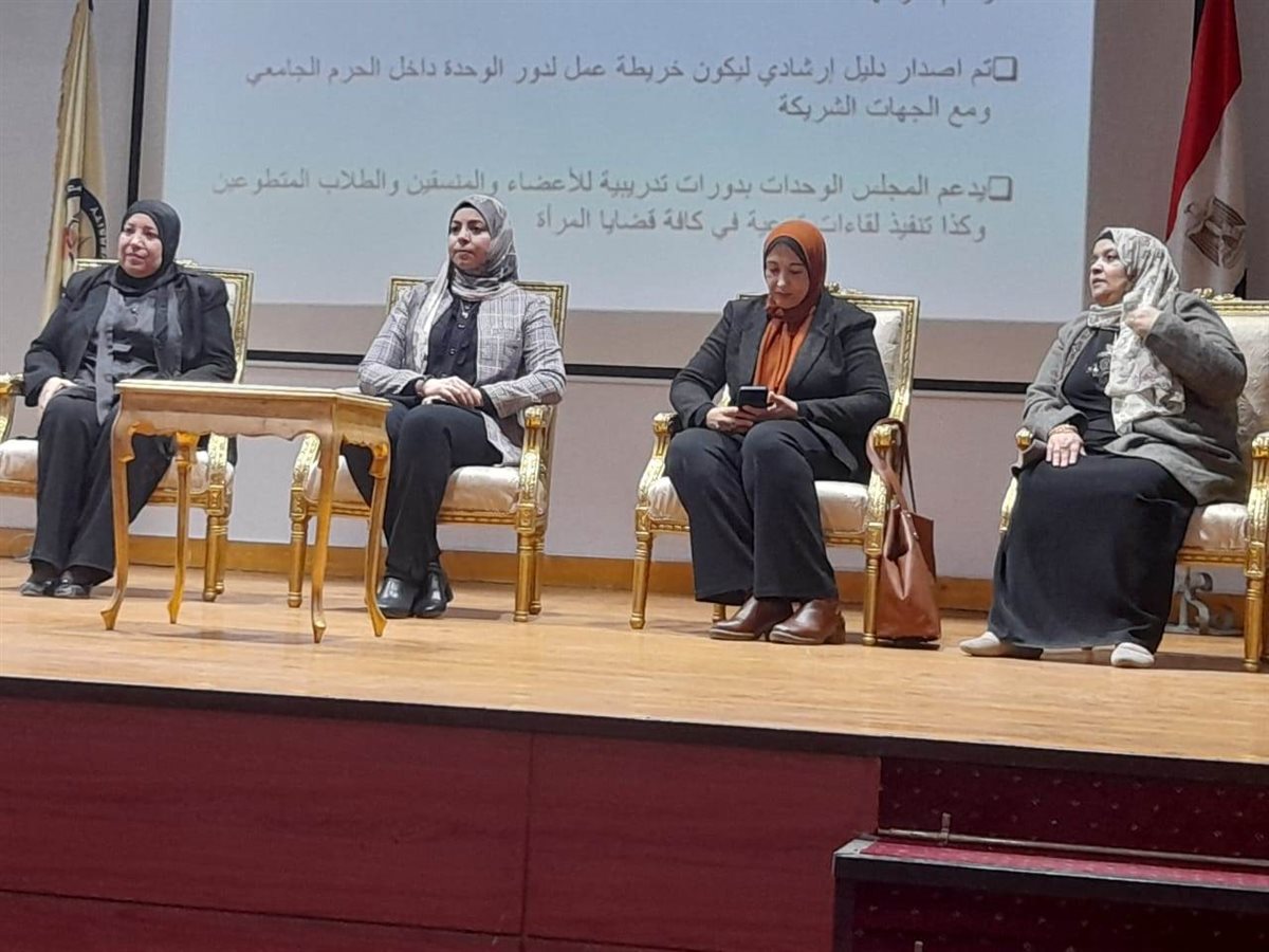 نظم المجلس القومي للمرأة لقاءً طلابيًا وورشة عمل بعنوان "تفعيل دور وحدات مناهضة العنف ضد المرأة بالجامعات المصرية" ، بالتعاون مع صندوق الأمم المتحدة للسكان والوكالة الأمريكية للتنمية الدولية، استهدف عضوات وأعضاء ومنسقي الوحدات ومنسقى الكليات والطلاب والطالبات بكليات الجامعة وباحثات وباحثين من الدراسات العليا المتطوعين مع الوحدة.