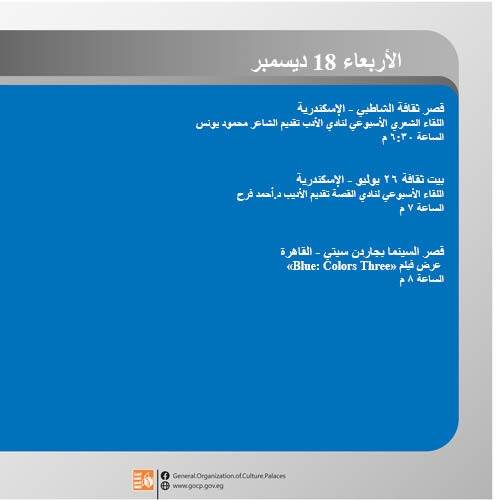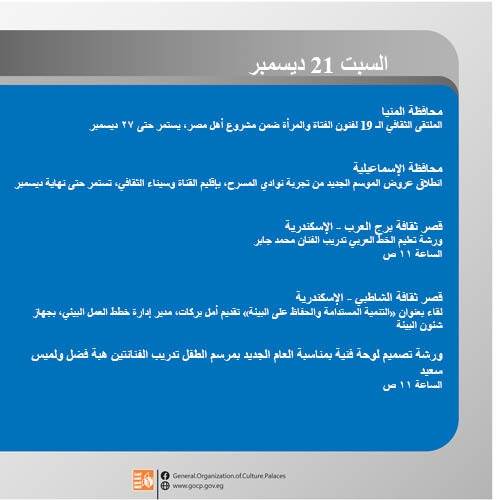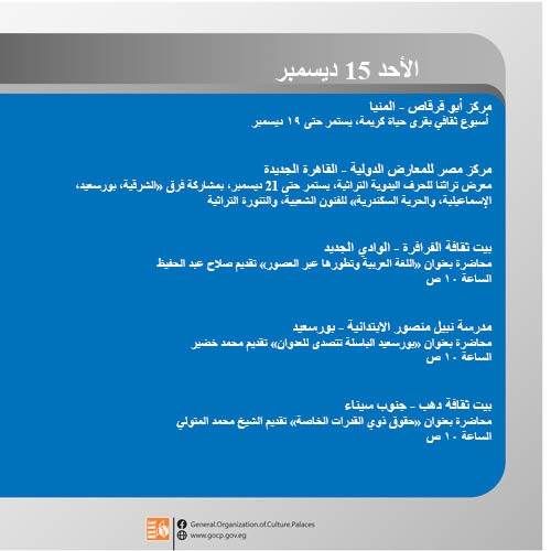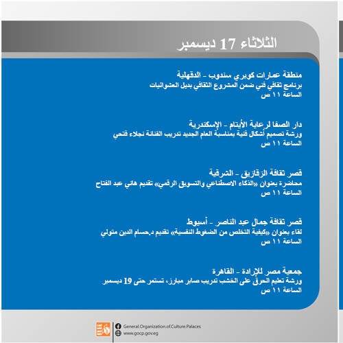 تواصل الهيئة العامة لقصور الثقافة تقديم فعالياتها الثقافية والفنية المتنوعة، ضمن برامج وزارة الثقافة، برعاية الدكتور أحمد فؤاد هنو، وزير الثقافة، وبإشراف الكاتب محمد ناصف، نائب رئيس الهيئة، وتشمل أجندة هذا الأسبوع، المستمرة حتى السبت 21 ديسمبر، أنشطة مميزة في مختلف المحافظات.