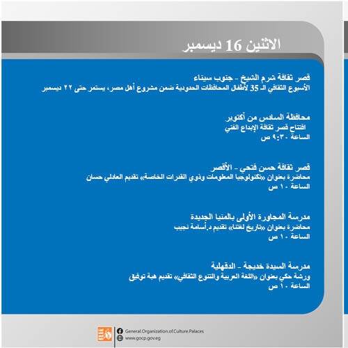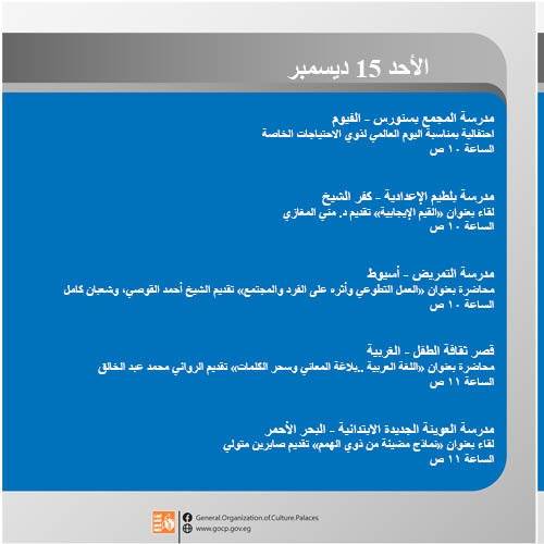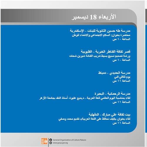 ويشهد الأسبوع مجموعة مميزة من الورش الفنية والحرفية يقدمها نخبة من المبدعين والمدربين، لأبناء المحافظة بالمجان، بجانب اللقاءات التثقيفية والتوعوية، ومعرض للكتاب، وورش اكتشاف وتنمية المواهب، وفقرات ترفيهية للأطفال، وذلك بمدرستي كوم المحرص، ومناهل الإعدادية، حتى 19 ديسمبر الحالي.