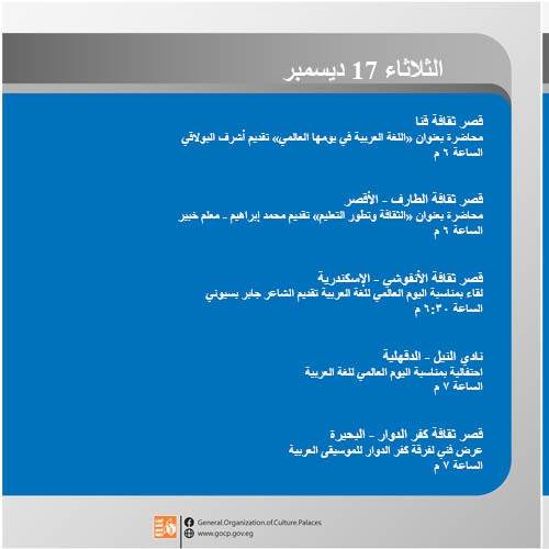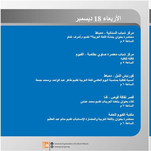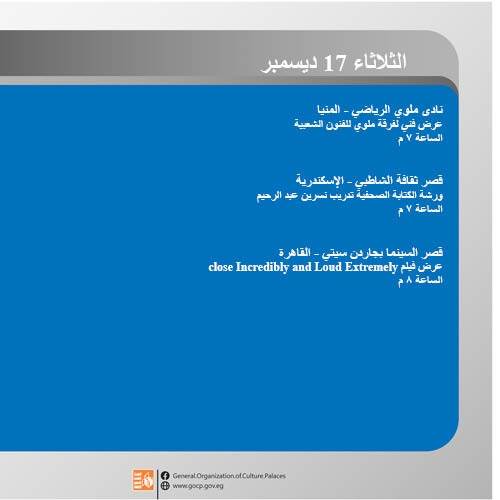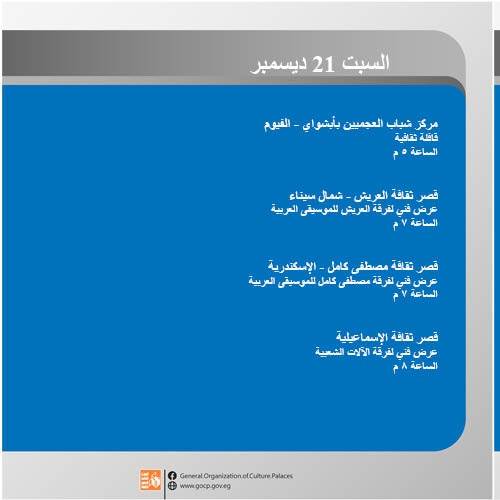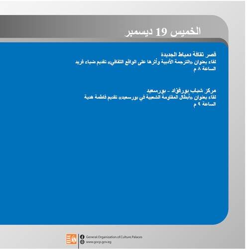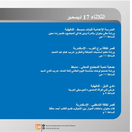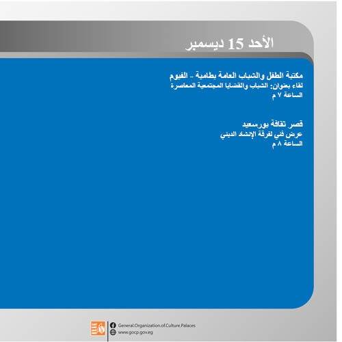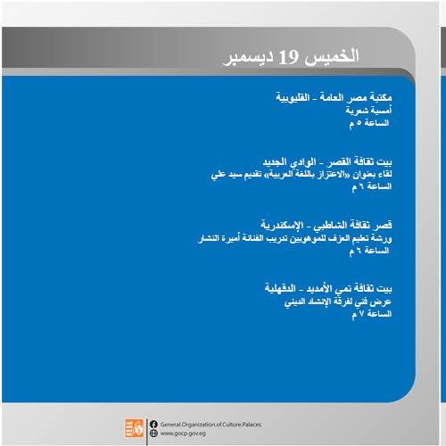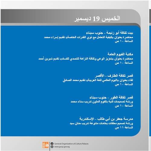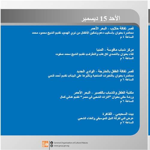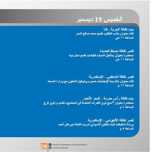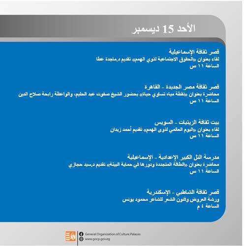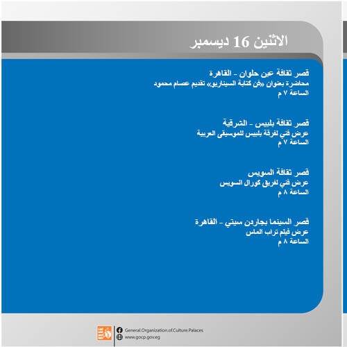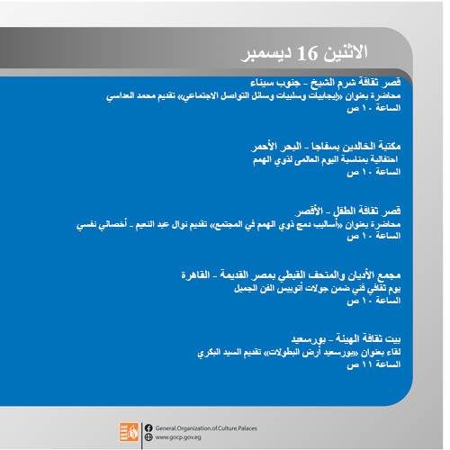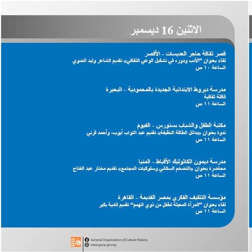 وتحفل الأجندة بمجموعة من اللقاءات المحاضرات واللقاءات التثقيفية والأدبية، والورش الفنية، هذا بالإضافة العروض المجانية بقصر السينما، الجولات التي ينظمها أتوبيس الفن الجميل للأطفال، والفعاليات المقامة بالمحافظات بمناسبة اليوم العالمي للغة العربية، ويوم ذوي الهمم، والعيد القومي لبورسعيد، وغيرها من الأنشطة التي تسهم في نشر الوعي الثقافي والفني وبناء الإنسان.
