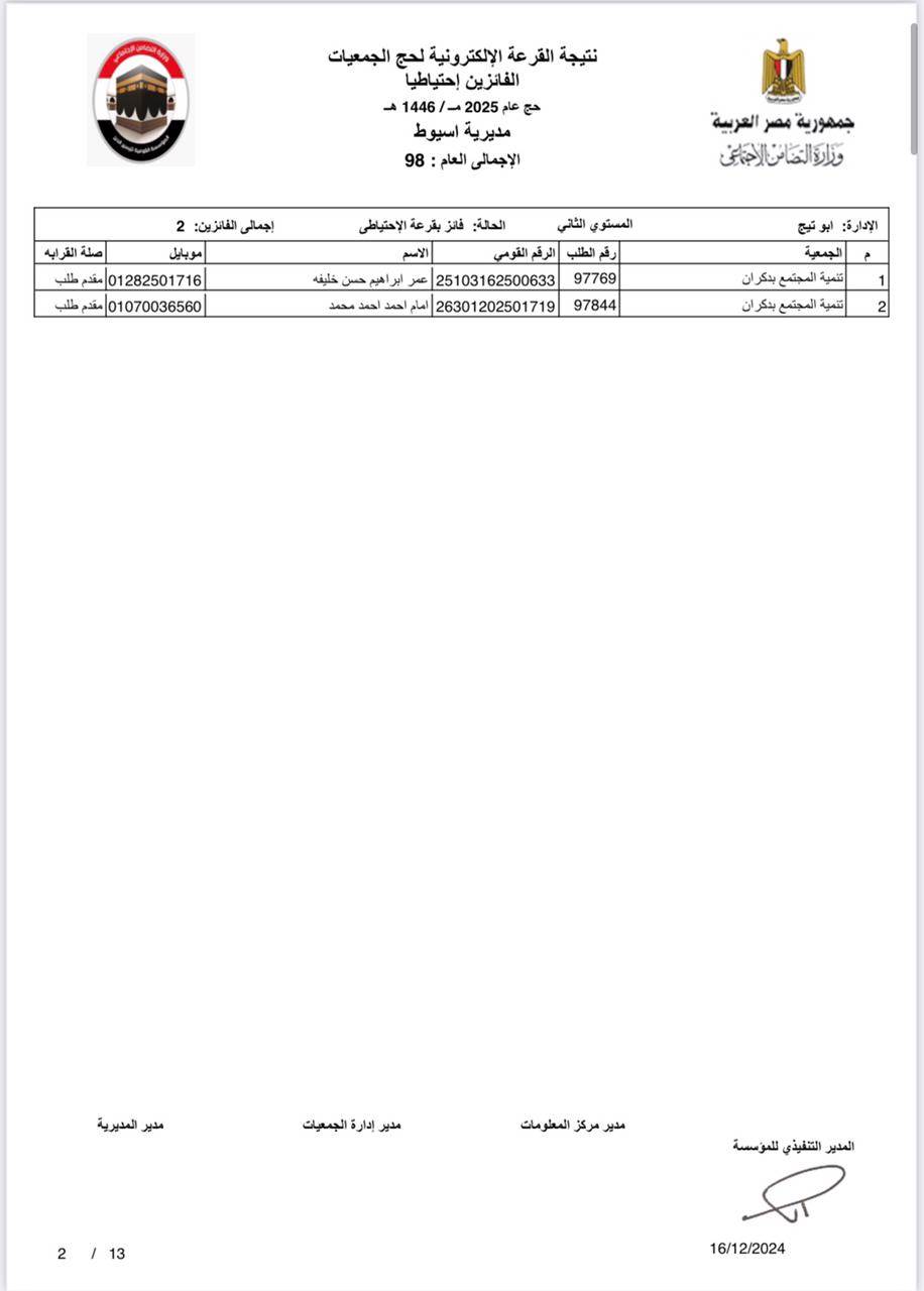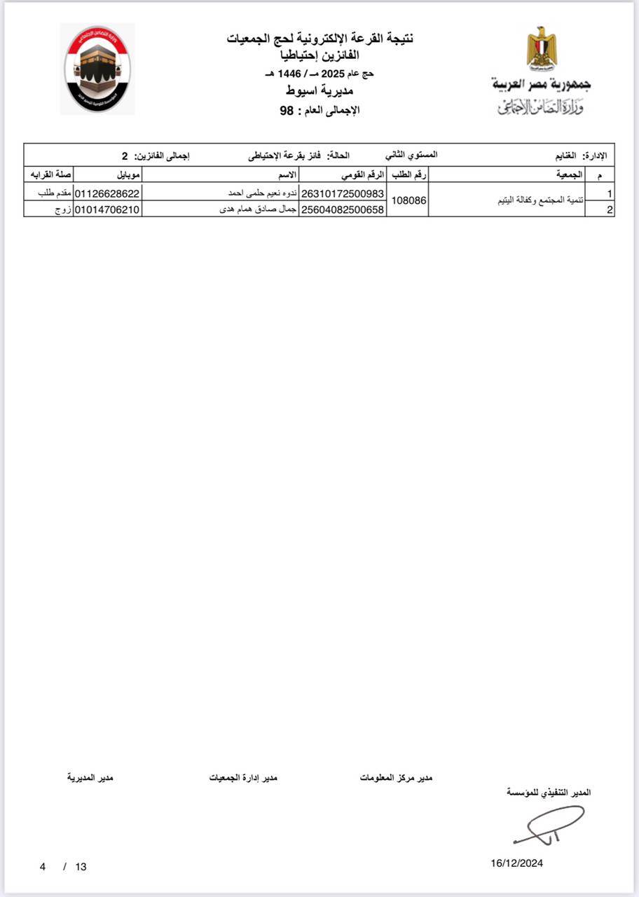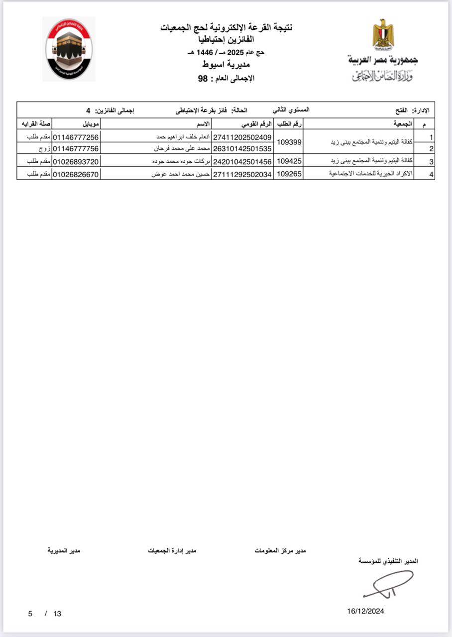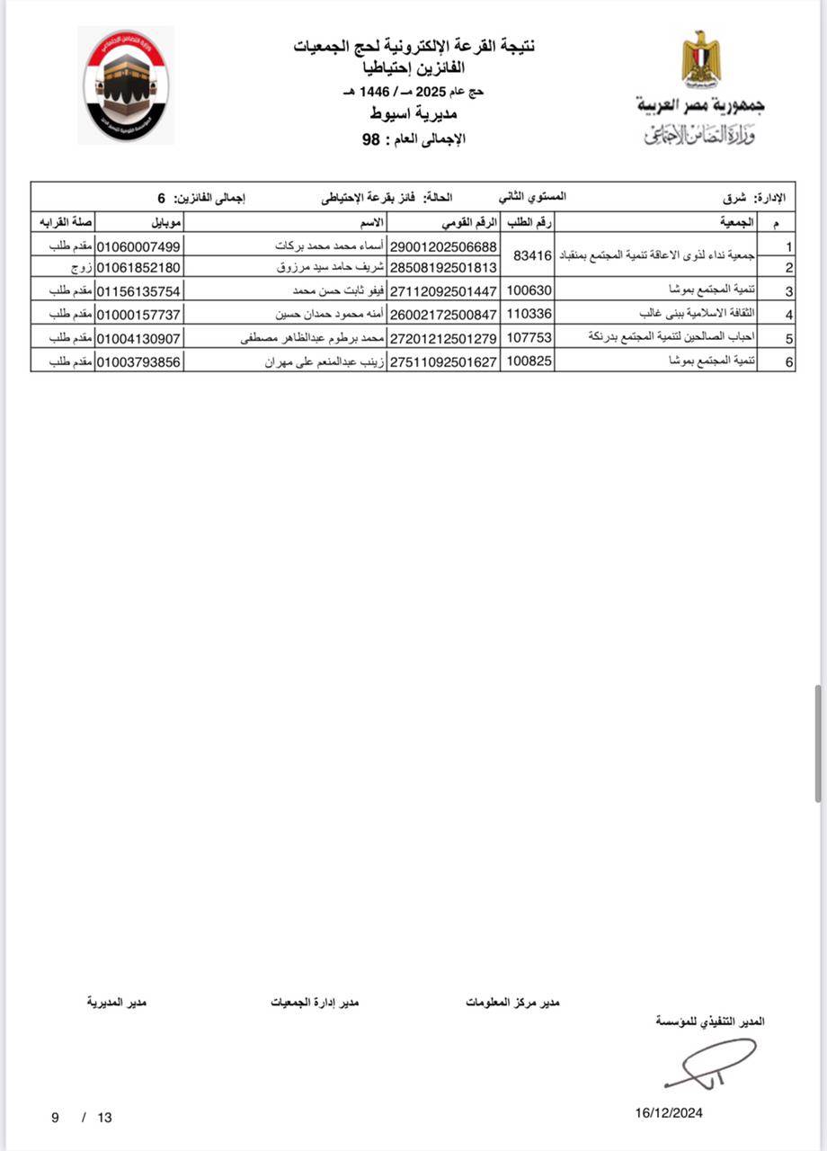 ننشر أسماء الفائزين في القرعة الإلكترونية لحج الجمعيات الأهلية بأسيوط