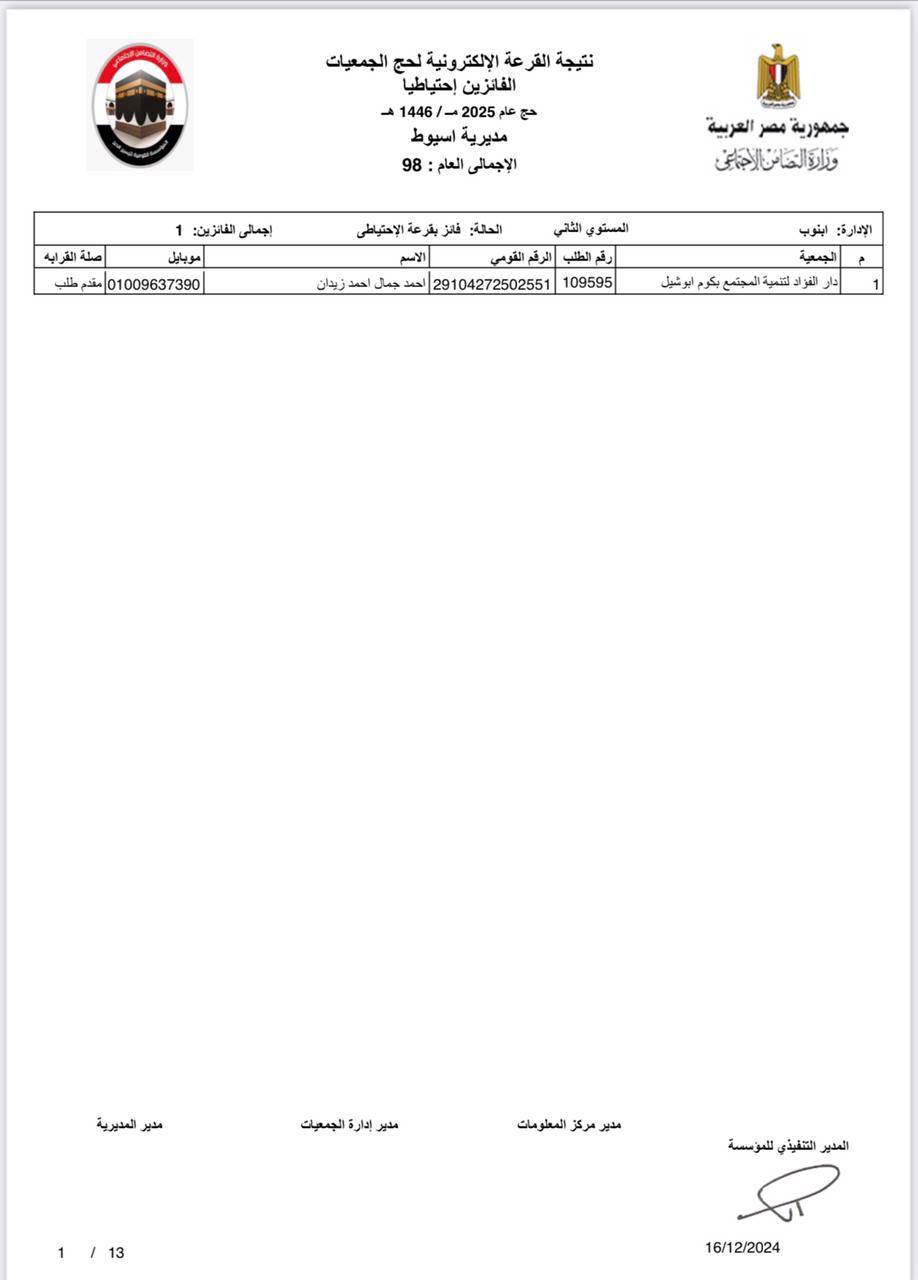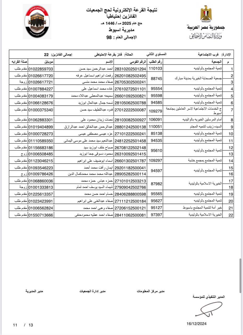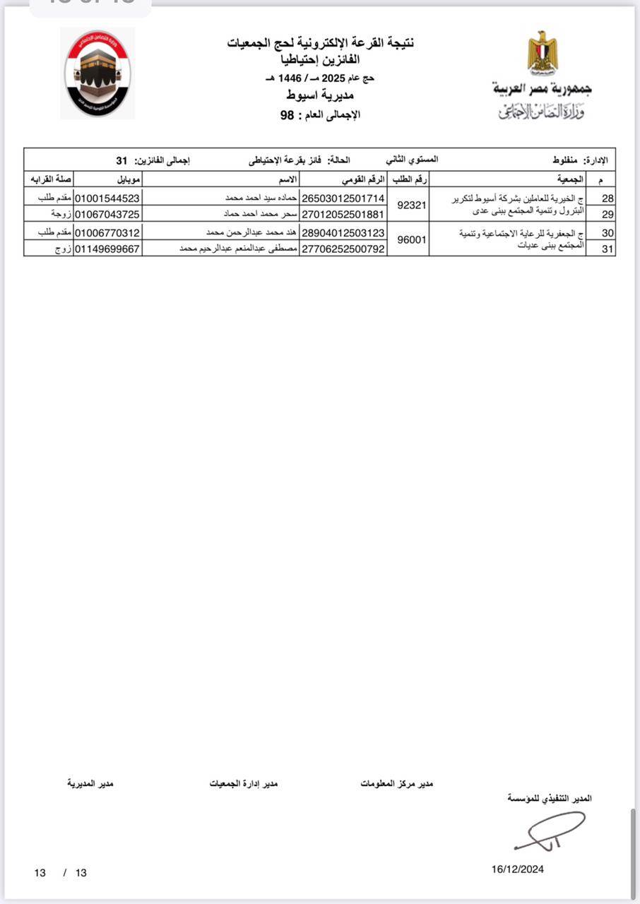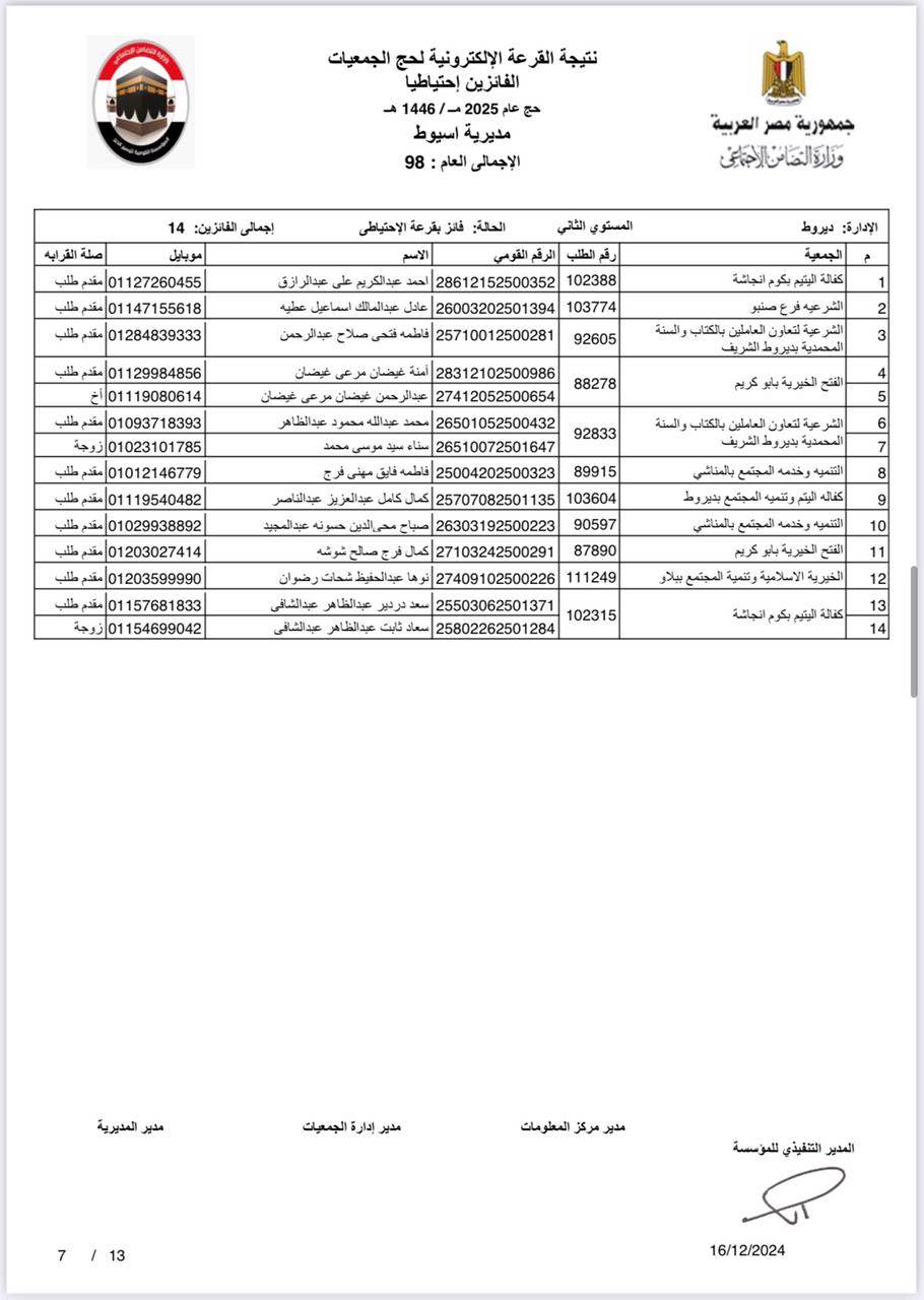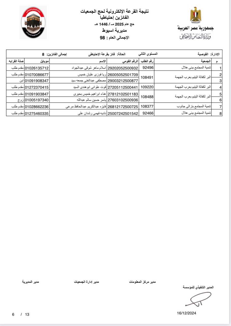 ننشر أسماء الفائزين في القرعة الإلكترونية لحج الجمعيات الأهلية بأسيوط