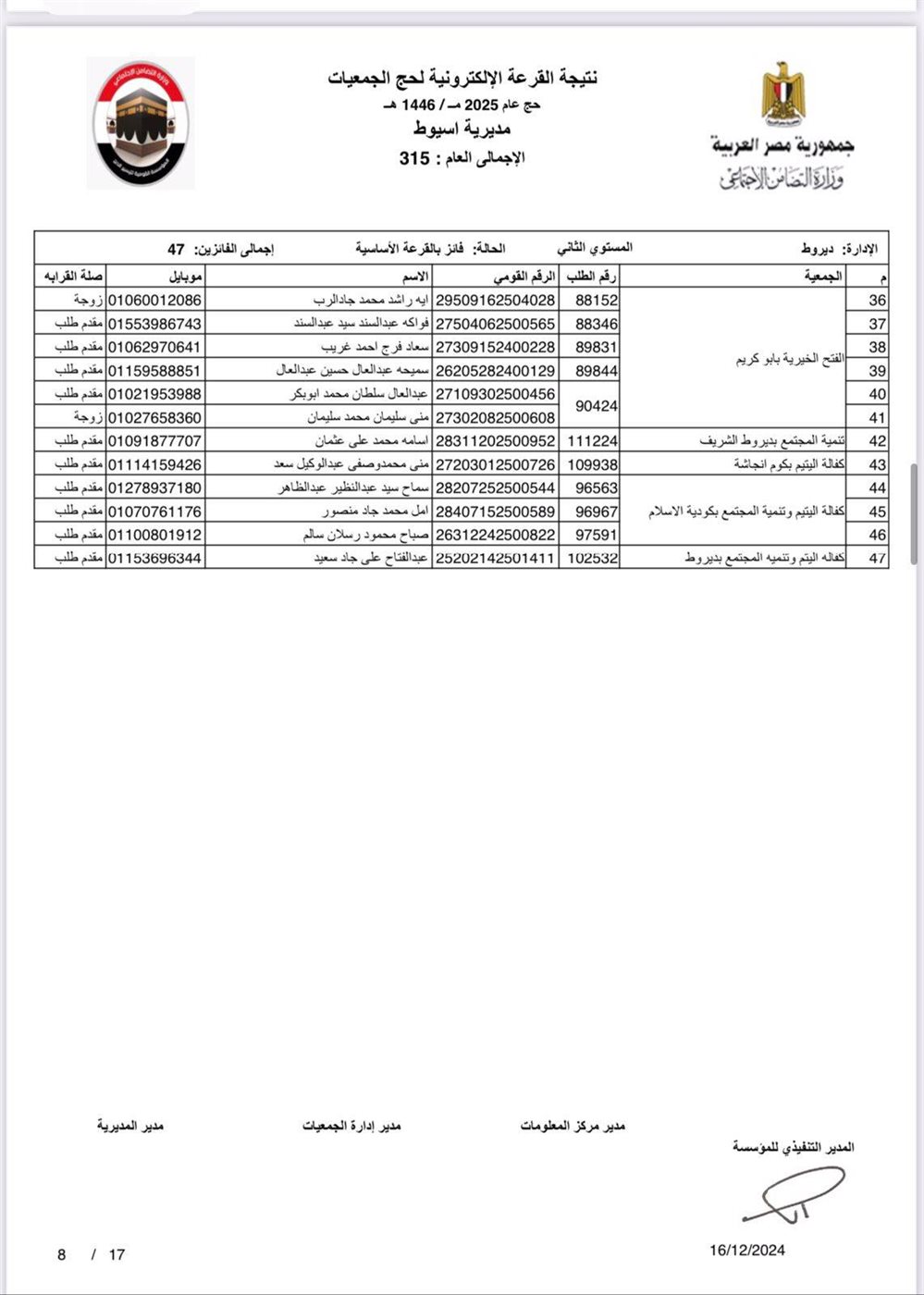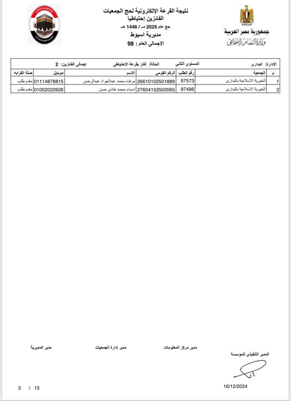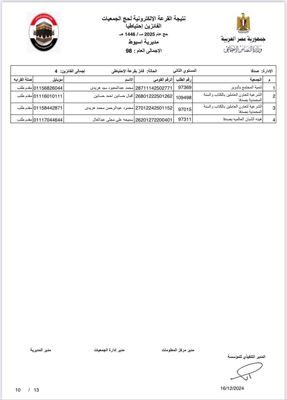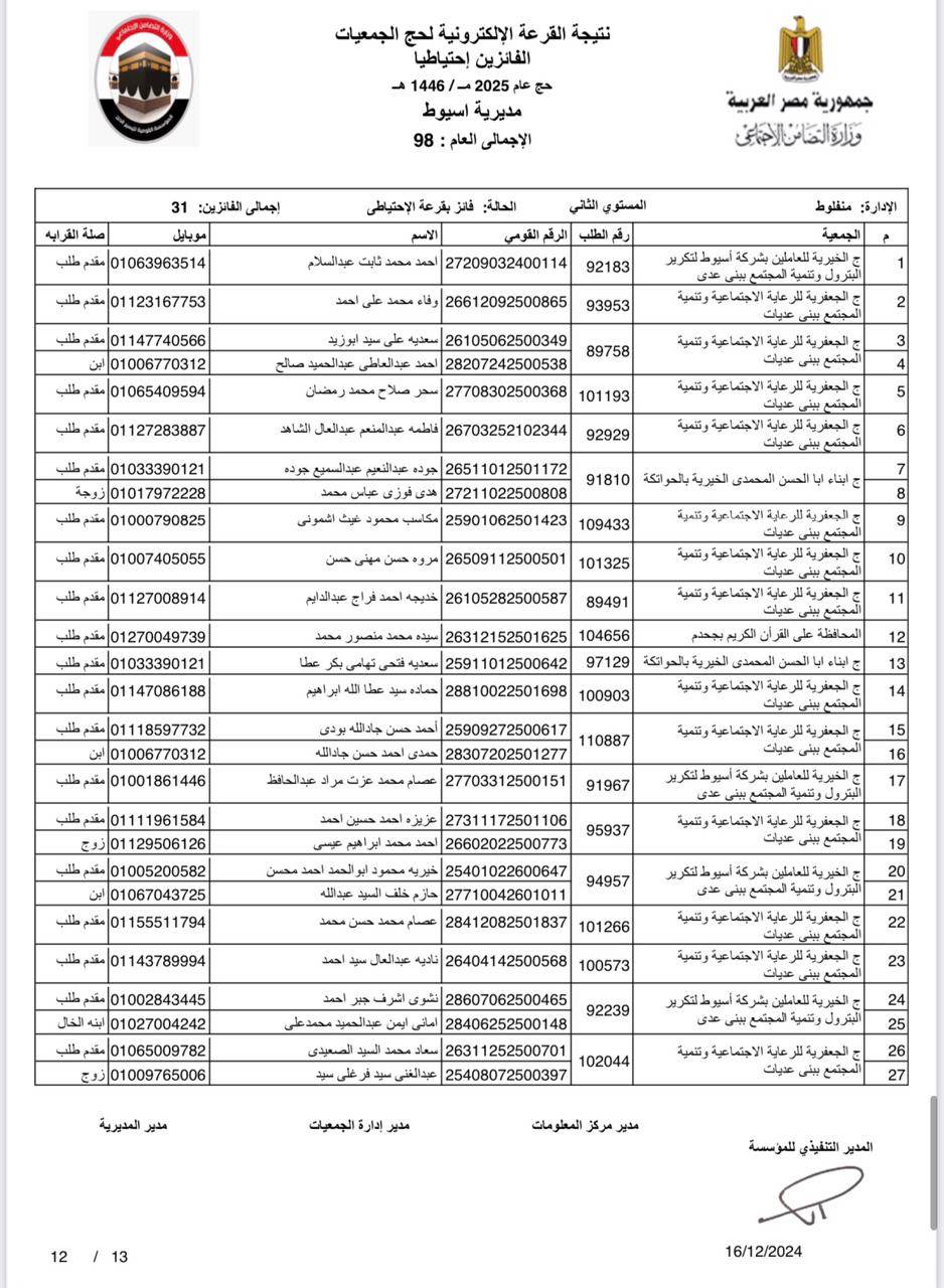 ننشر أسماء الفائزين في القرعة الإلكترونية لحج الجمعيات الأهلية بأسيوط