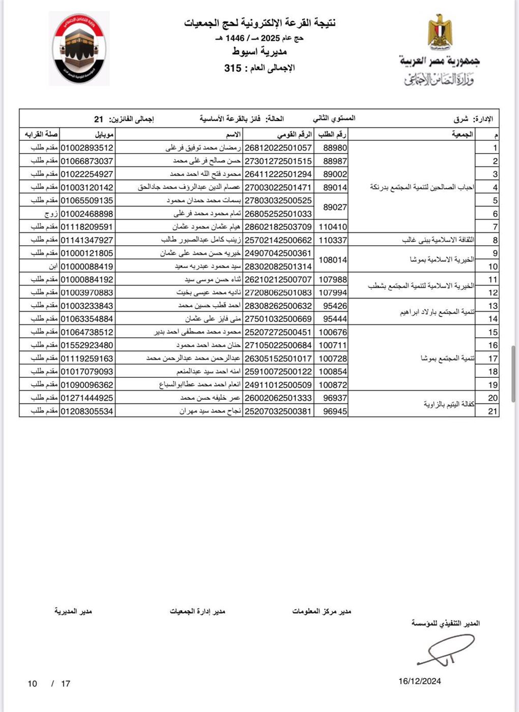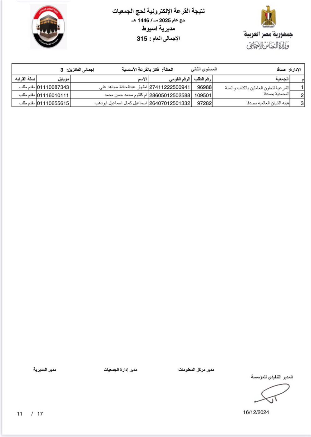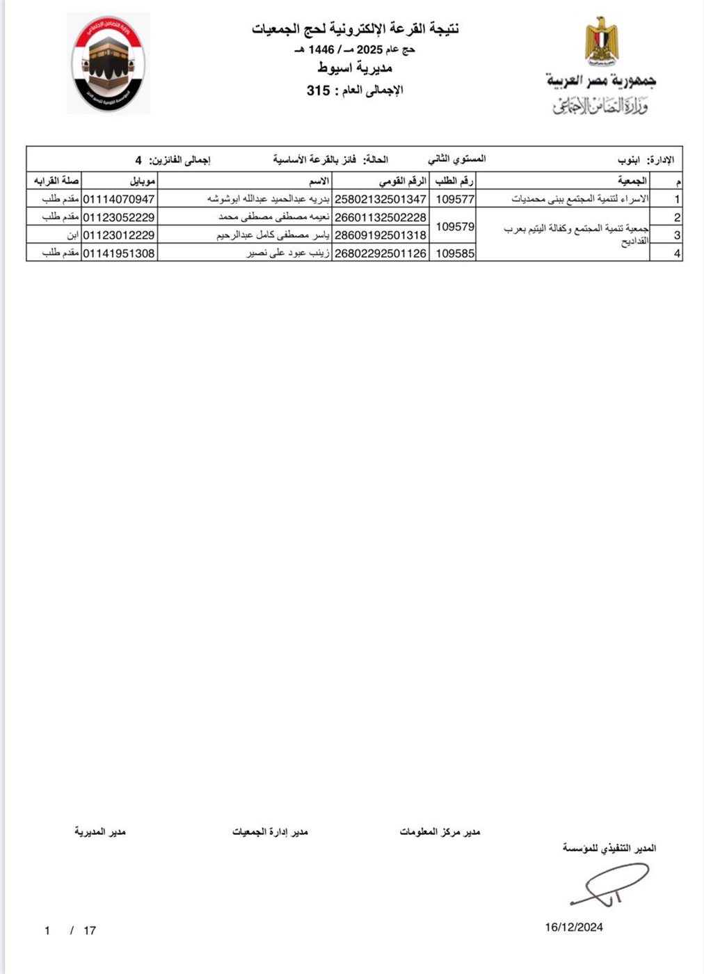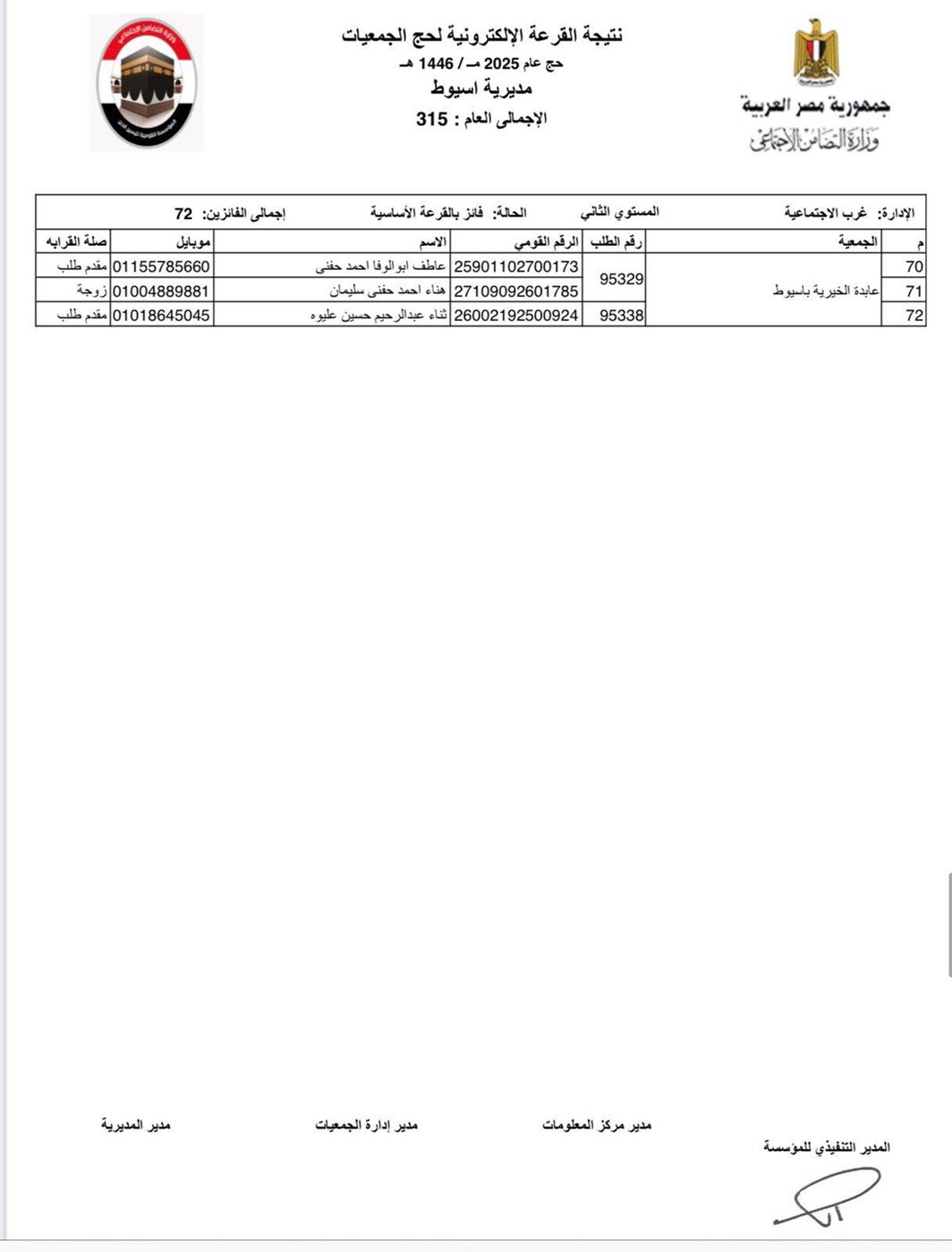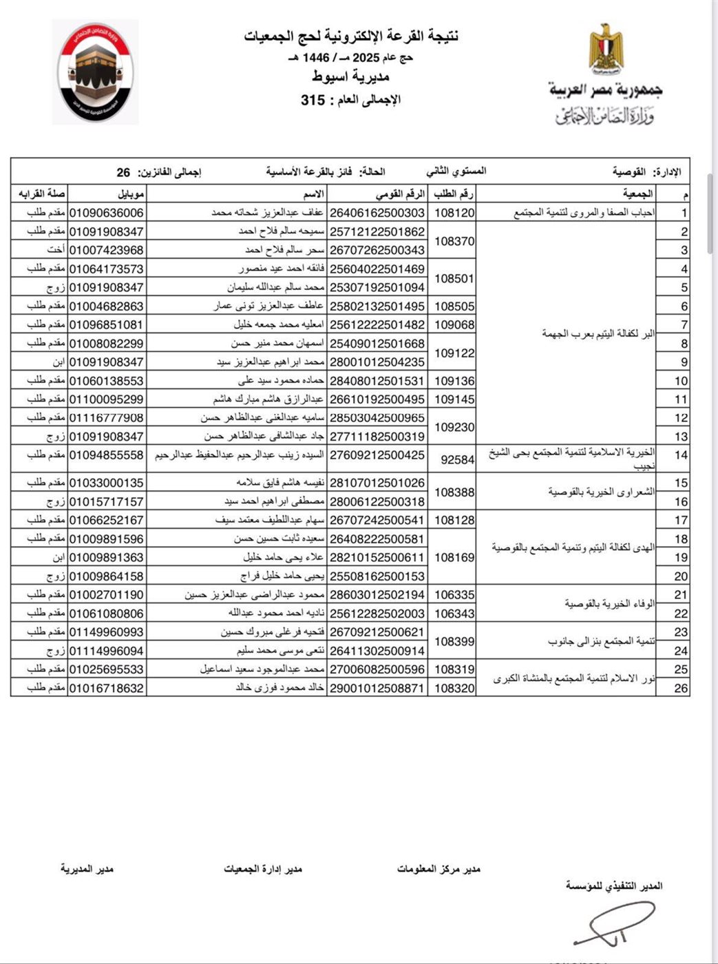 ننشر أسماء الفائزين في القرعة الإلكترونية لحج الجمعيات الأهلية بأسيوط