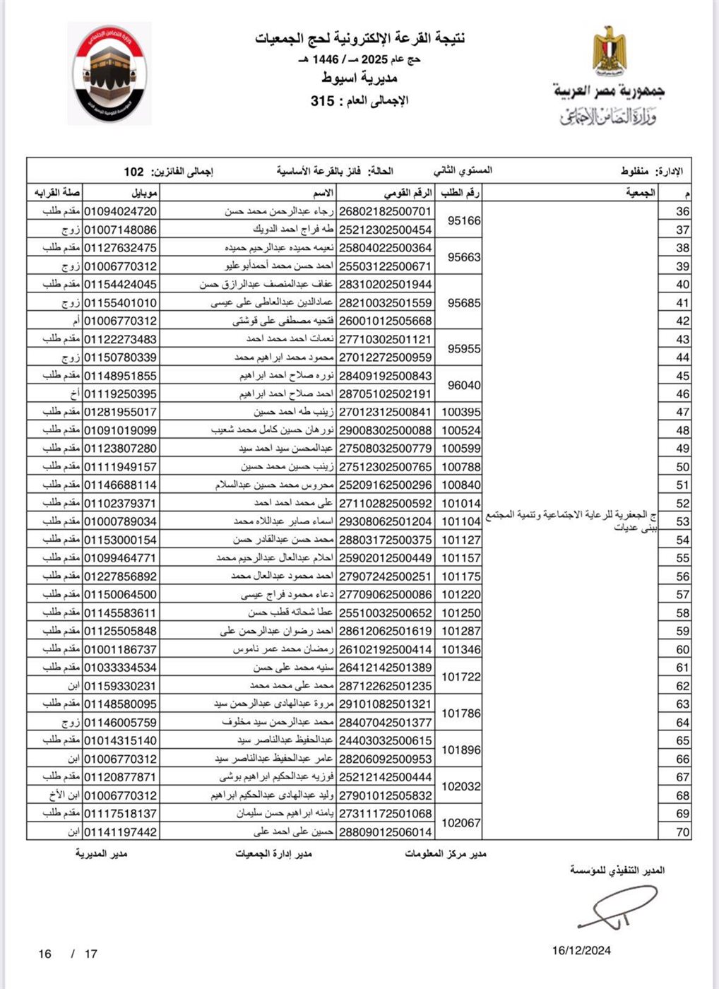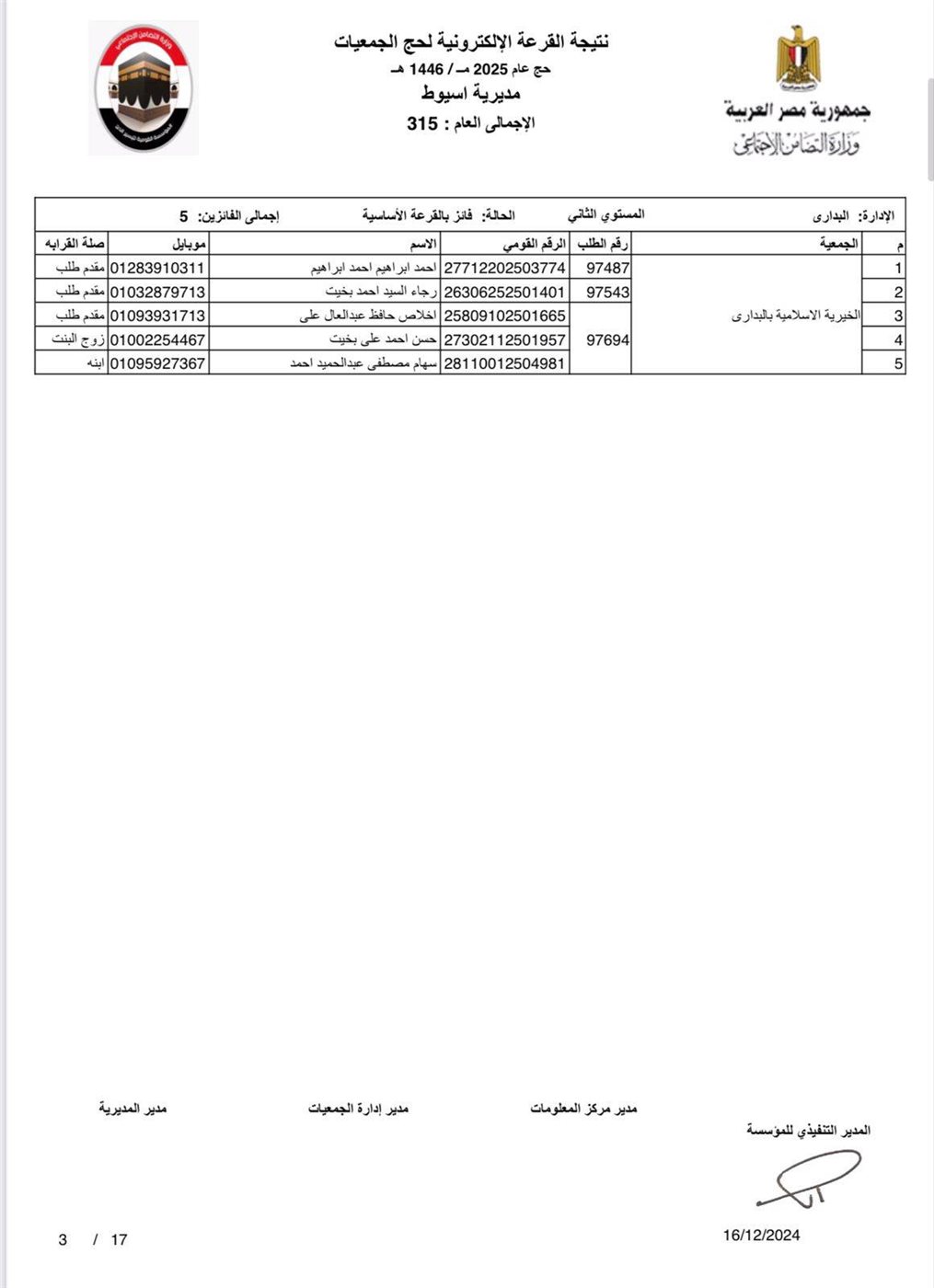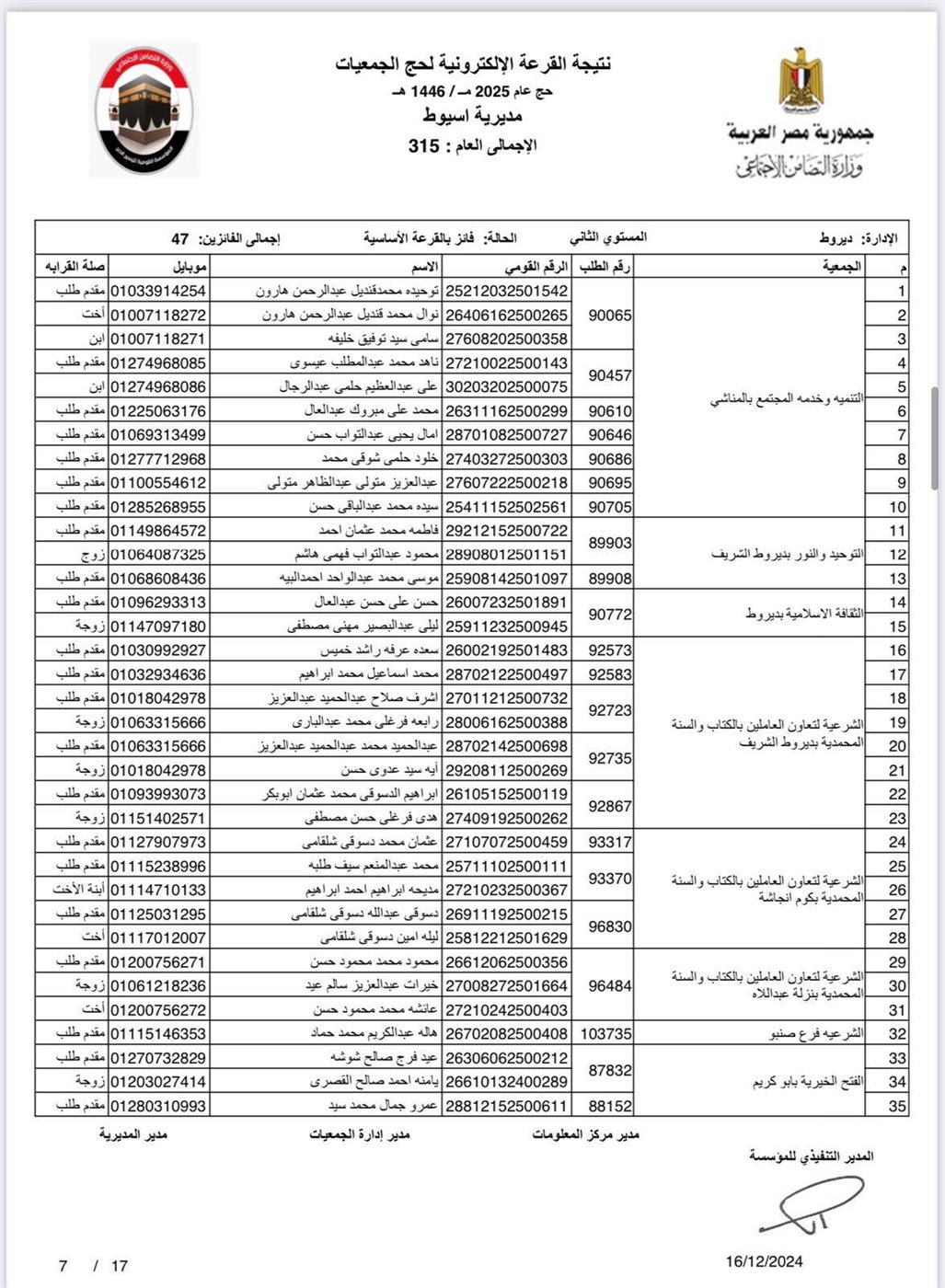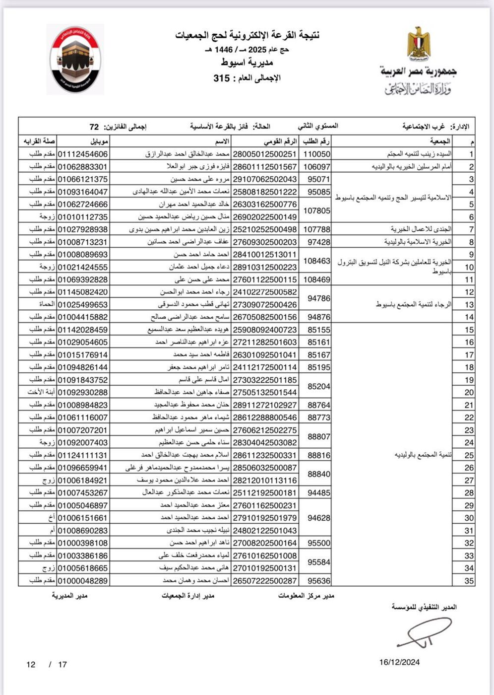 ننشر أسماء الفائزين في القرعة الإلكترونية لحج الجمعيات الأهلية بأسيوط