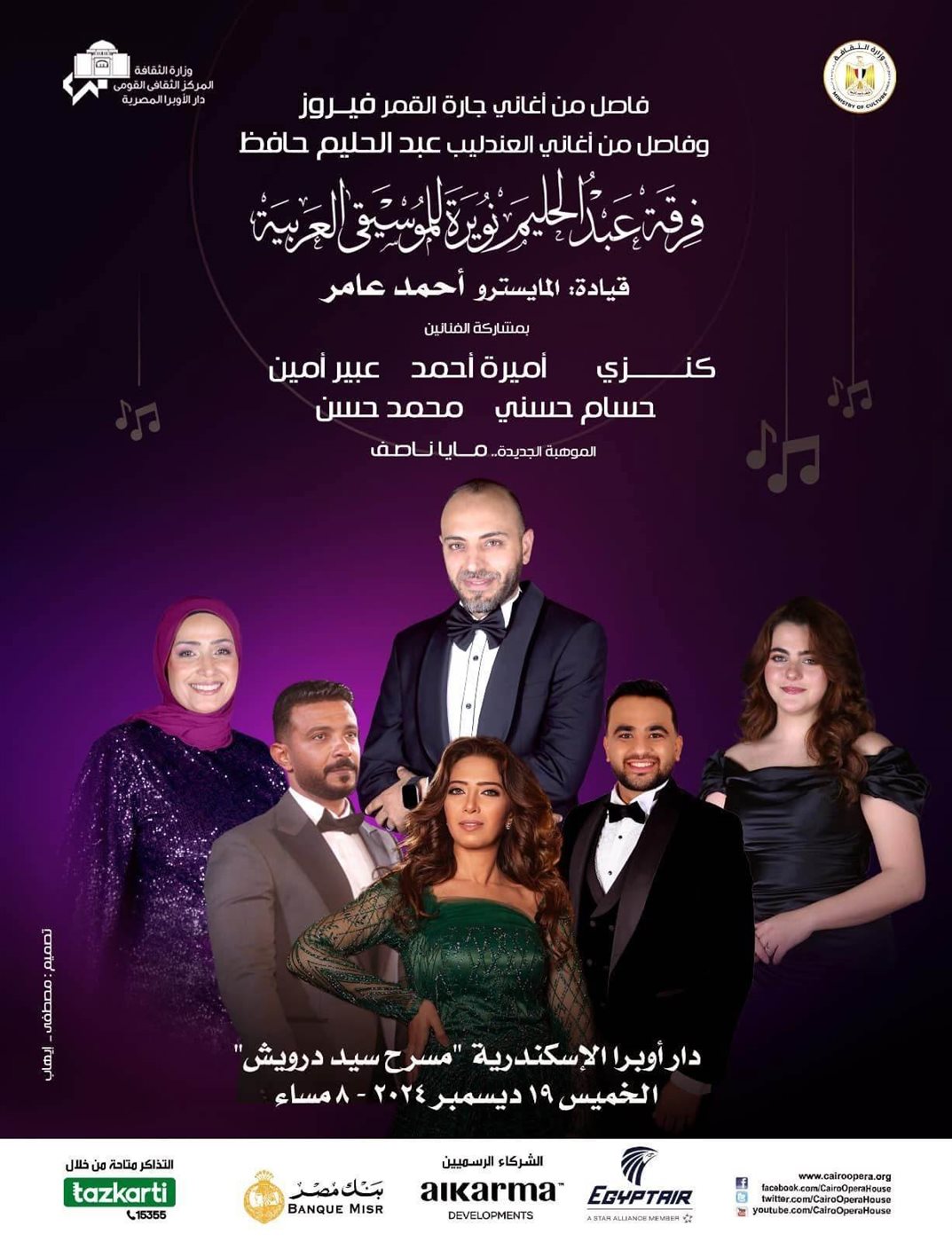 تواصل وزارة الثقافة المصرية رحلتها للإحتفاء بقامات الإبداع من خلال دار الأوبرا برئاسة الدكتورة لمياء زايد، التي تنظم حفلاً لأعمال كلاً من عبد الحليم حافظ وفيروز وتحييه فرقة عبد الحليم نويرة للموسيقى العربية، بقيادة المايسترو أحمد عامر وذلك في الثامنة مساء الخميس ١٩ ديسمبر 2024 على مسرح سيد درويش "أوبرا الإسكندرية".