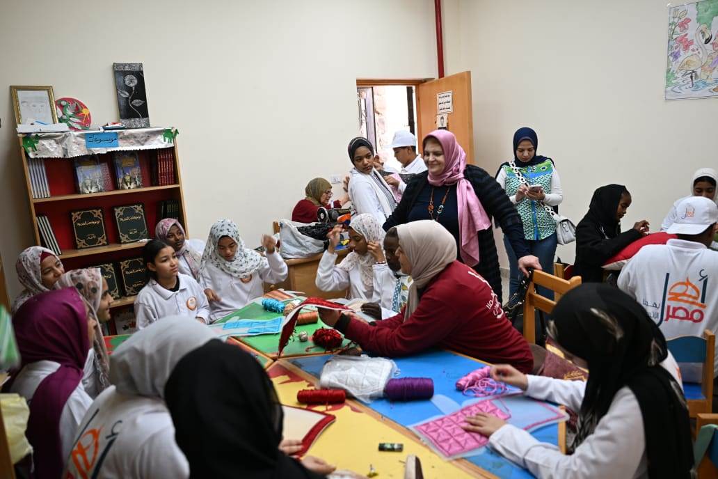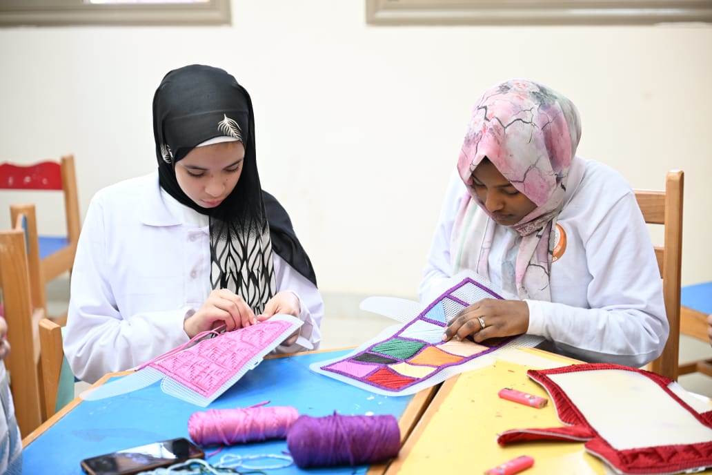 وأوضح المدرب عماد عاشور طريقة قص قماش الخيامية و تطريزه باستخدام الغرزة السحرية، مع البدء في تنفيذ خداديات تحمل شكل زهرة اللوتس بألوان متناسقة.