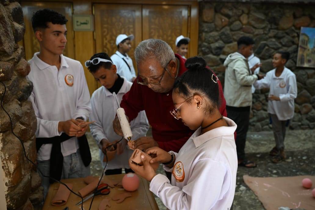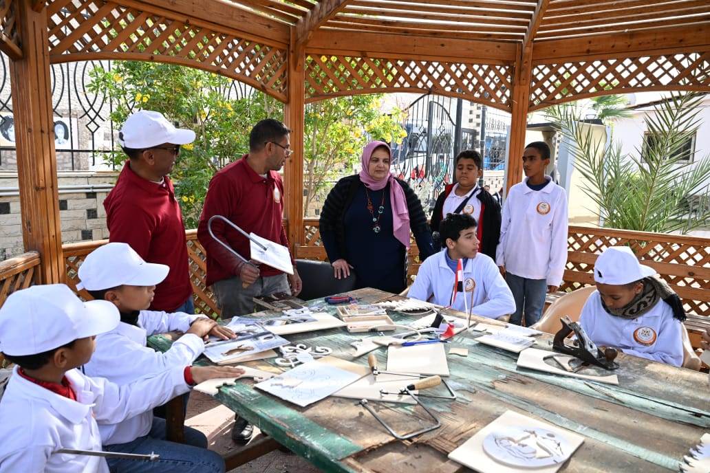 من ناحية أخرى، وضمن الورش الحرفية، قام المدرب حسني إبراهيم خلال "ورشة الأركت" بتدريب الأطفال على طريقة عمل التصميم ونقله على الخشب للبدء في التفريغ.