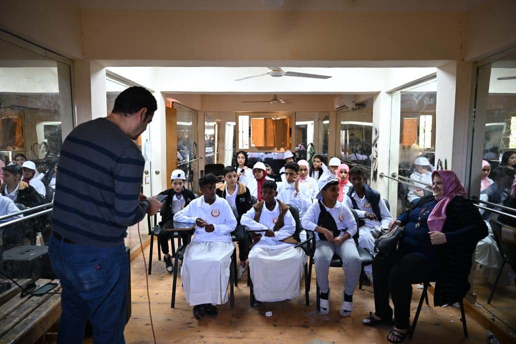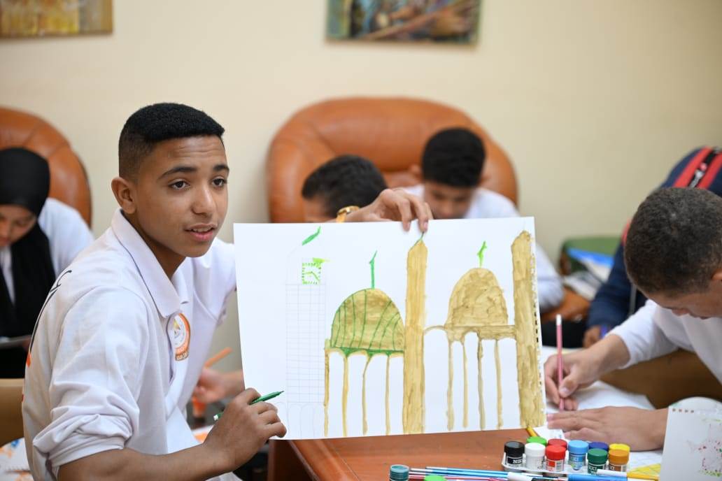 وفي ورشة "الرسم بالموسيقى" قام الفنان وائل عوض بتدريب الأطفال على كيفية عمل تصميمات فنية مستوحاة من زيارتهم التفقدية السابقة لمسجد الصحابة بمنطقة السوق التجاري القديم.