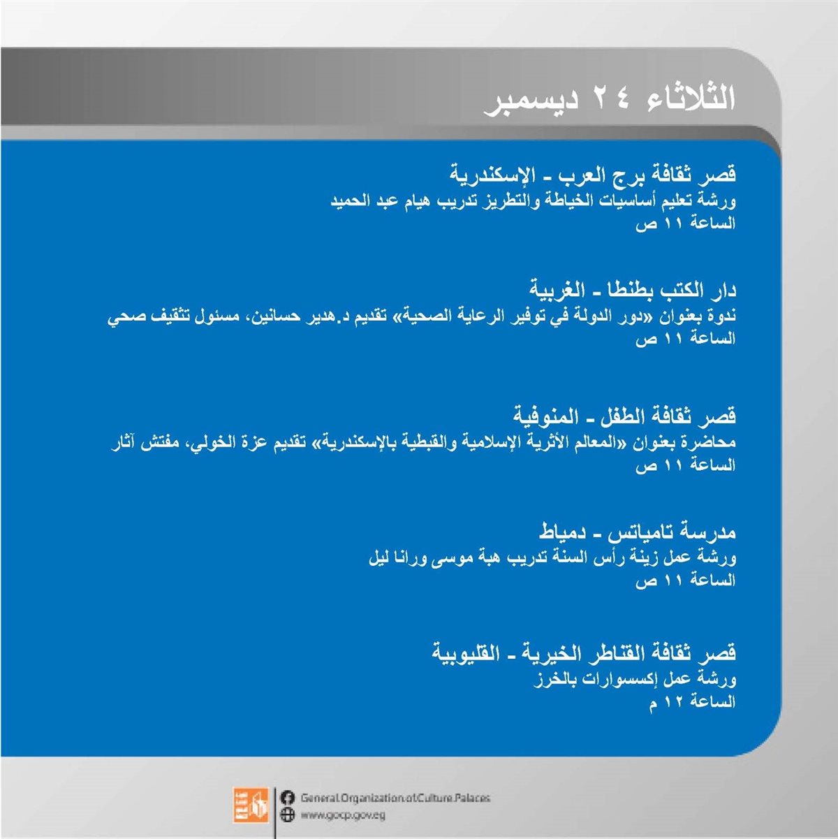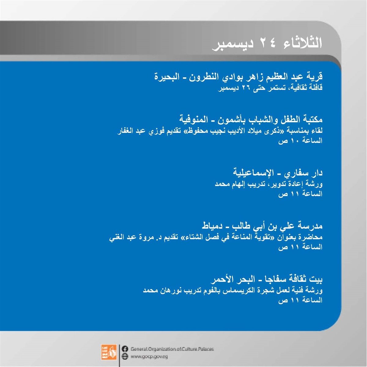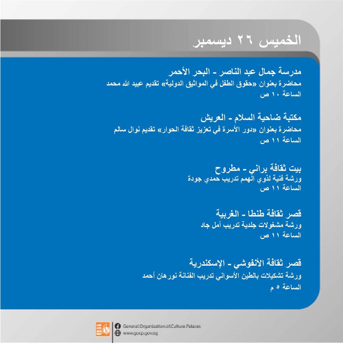 وتنطلق الفعاليات اليوم الأحد وتتنوع بين الورش الإبداعية، العروض الفنية والمسرحية، والأمسيات الثقافية، وحتى السبت المقبل 28 ديسمبر في مختلف محافظات الجمهورية.