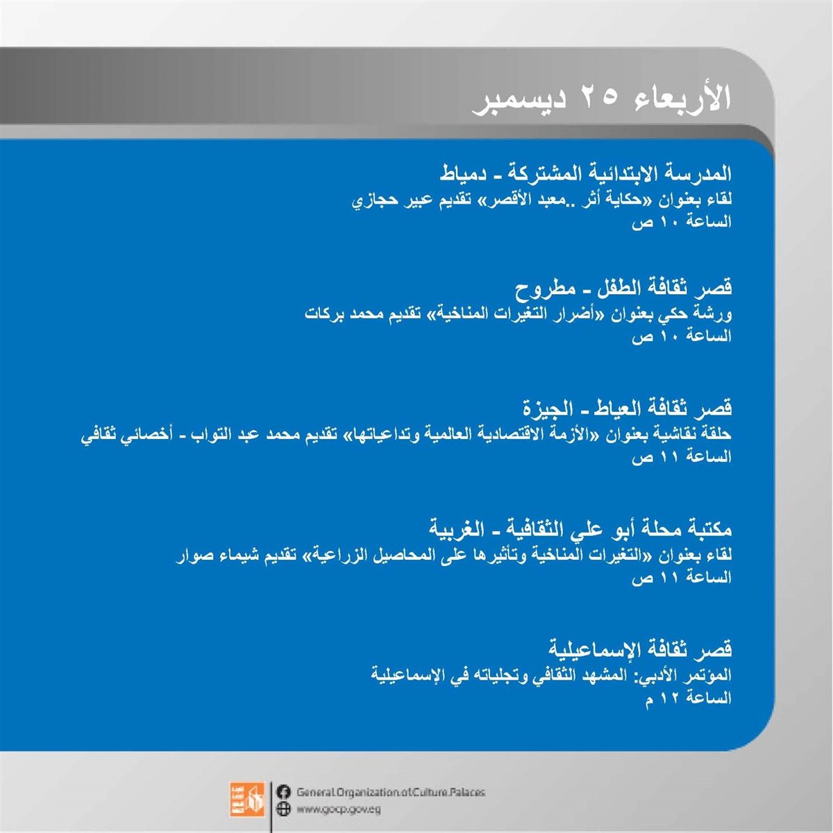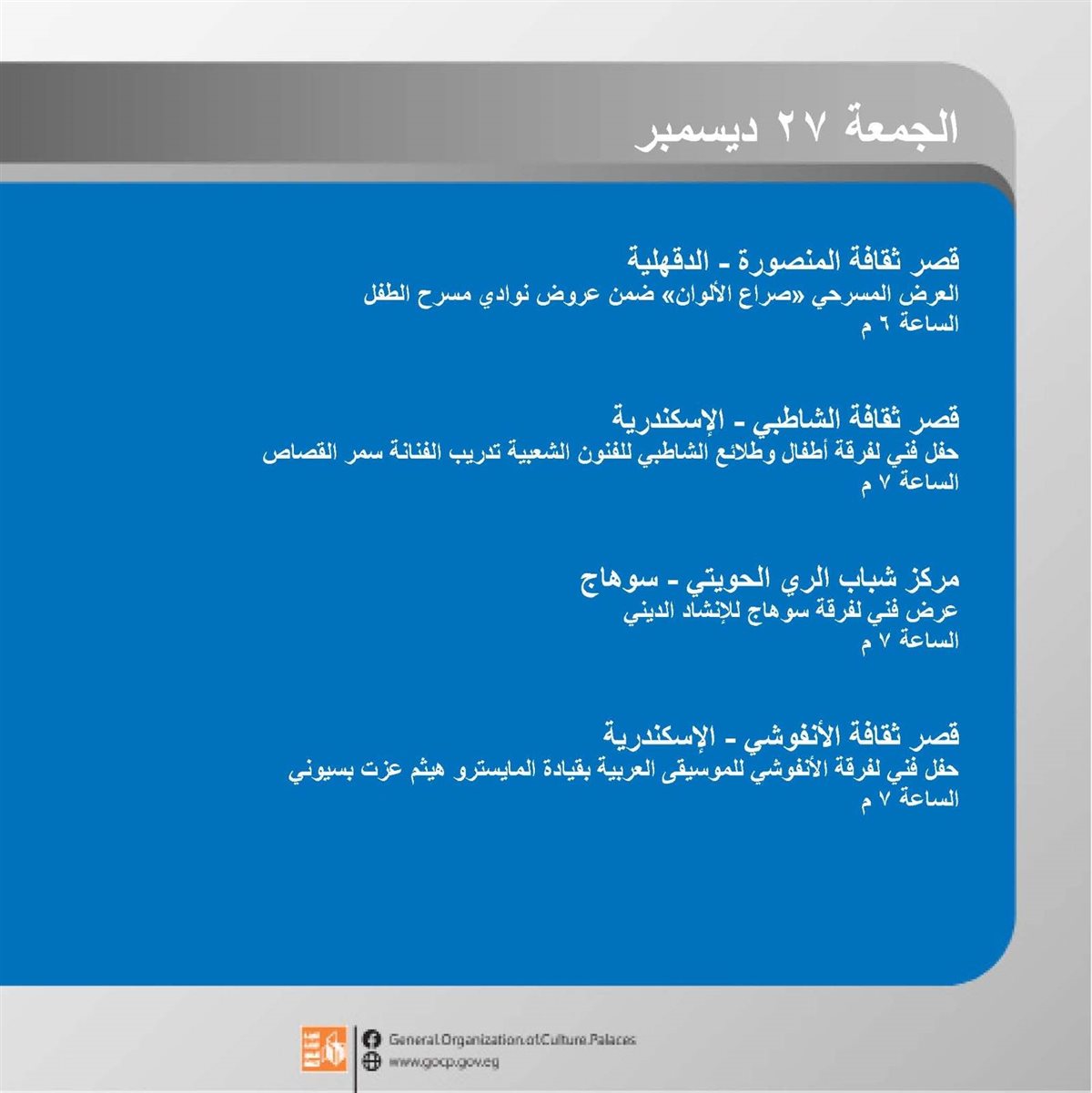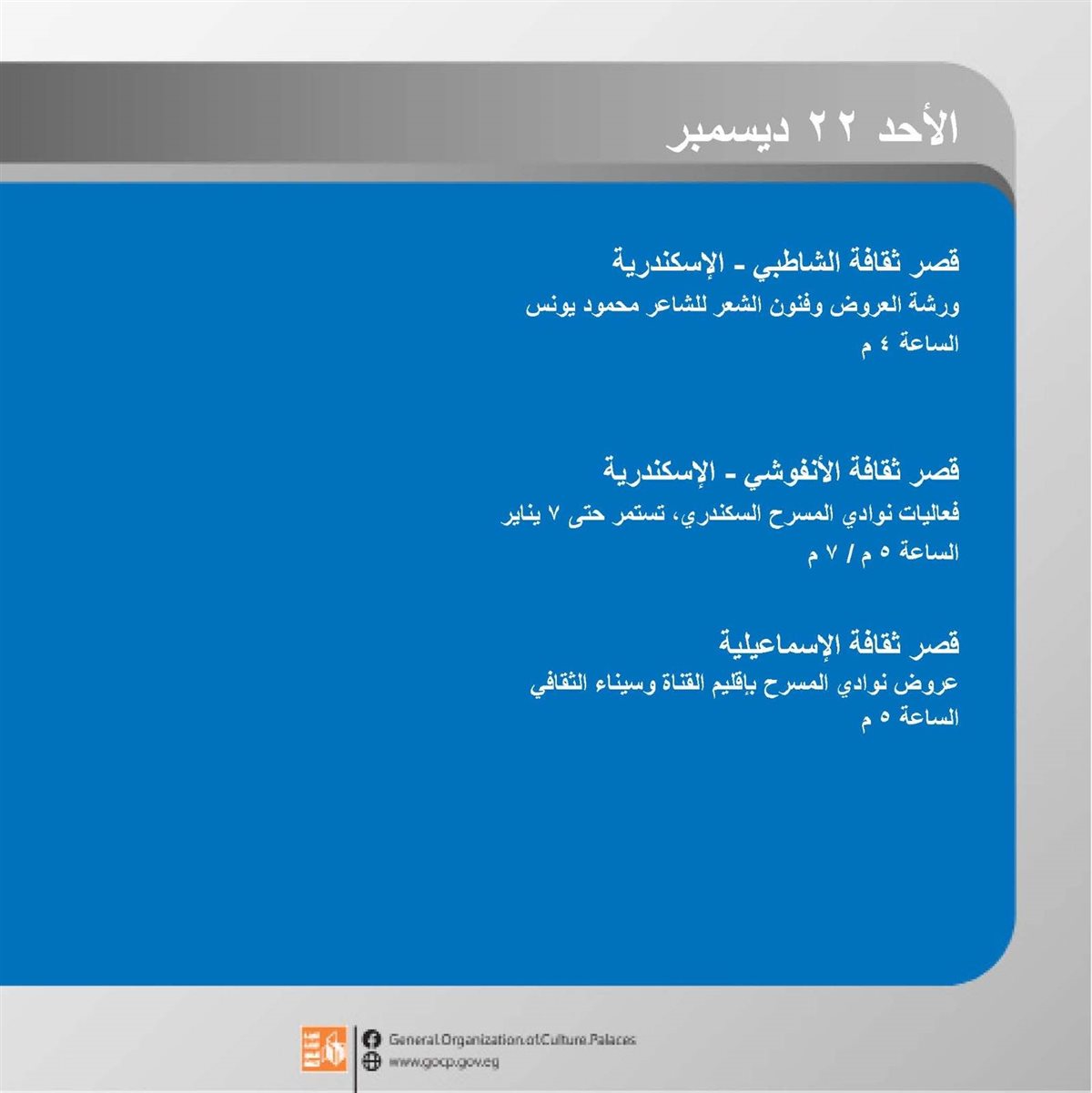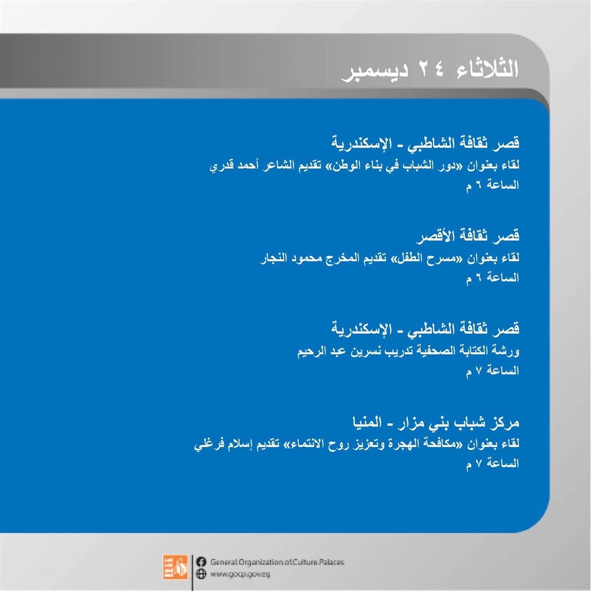 وتنطلق الفعاليات اليوم الأحد وتتنوع بين الورش الإبداعية، العروض الفنية والمسرحية، والأمسيات الثقافية، وحتى السبت المقبل 28 ديسمبر في مختلف محافظات الجمهورية.