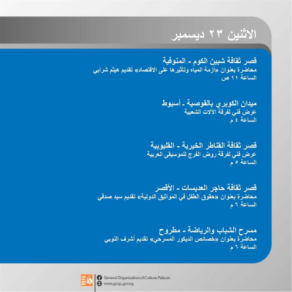 وتحفل الأجندة بمجموعة من المحاضرات التثقيفية والتوعوية، اللقاءات الأدبية والورش الفنية، هذا بالإضافة العروض المجانية بقصر السينما، والقوافل الثقافية بمحافظة البحيرة ضمن البرامج المنفذة بقرى المبادرة الرئاسية "حياة كريمة" تحقيقا لمبدأ العدالة الثقافية.