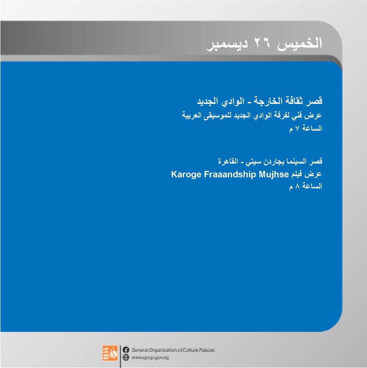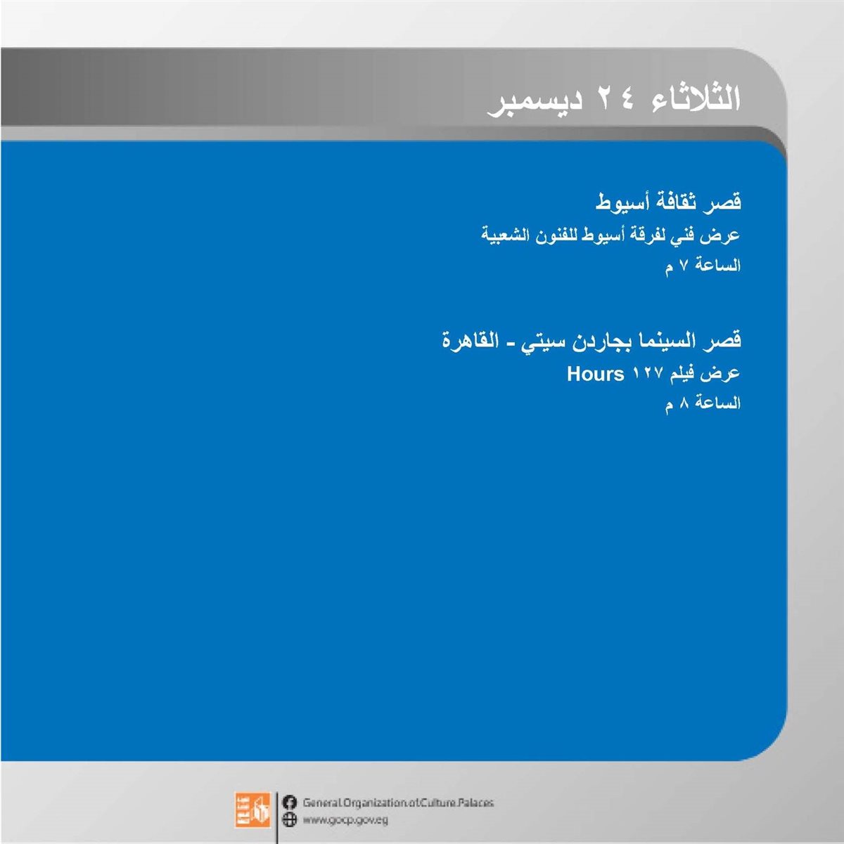 ضمن برامج وزارة الثقافة، وبرعاية الدكتور أحمد فؤاد هنو، وزير الثقافة، تقدم الهيئة العامة لقصور الثقافة هذا الأسبوع أجندة غنية بالفعاليات الثقافية والفنية، بإشراف الكاتب محمد ناصف، نائب رئيس الهيئة.
