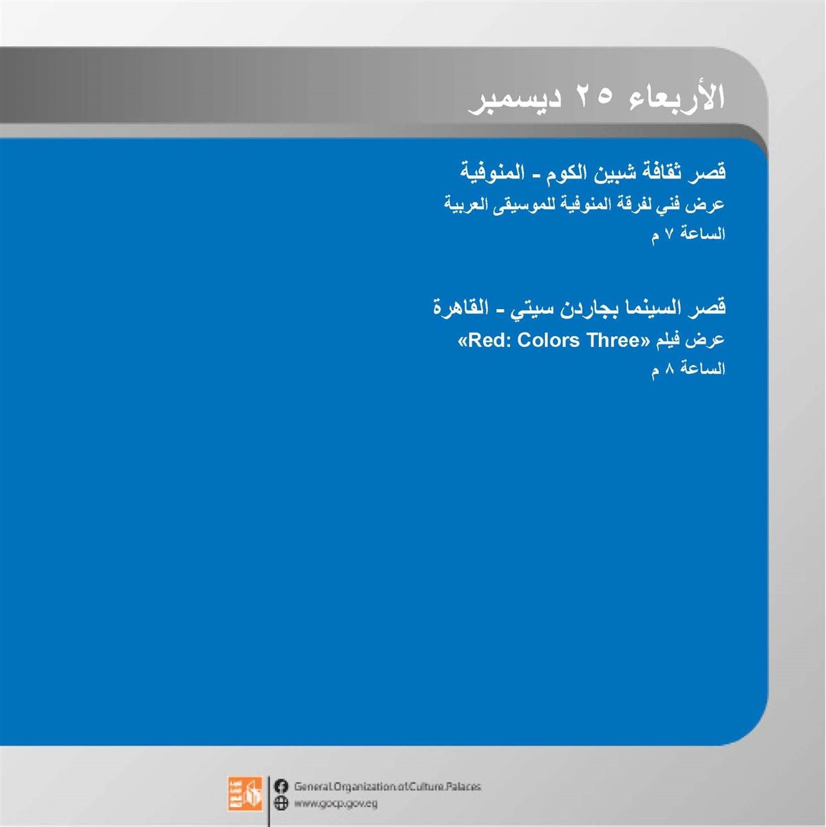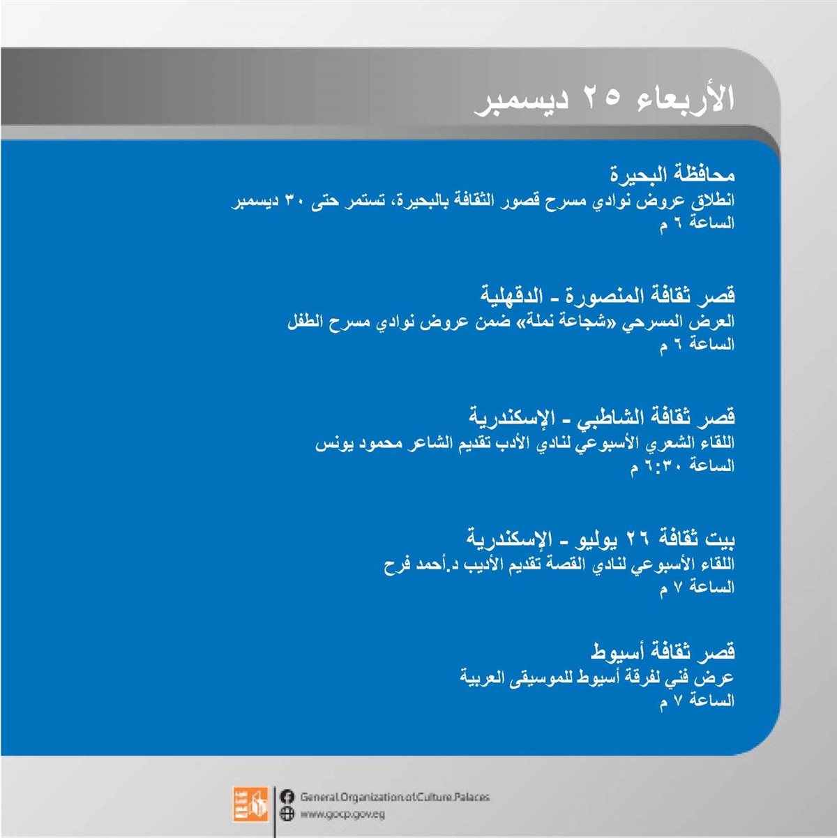 وتستضيف مسارح قصور الثقافة بمحافظة البحيرة ٢٥ عرضا بدءا من الأربعاء المقبل ٢٥ ديسمبر، يستمر عرضها لمدة ٦ أيام.