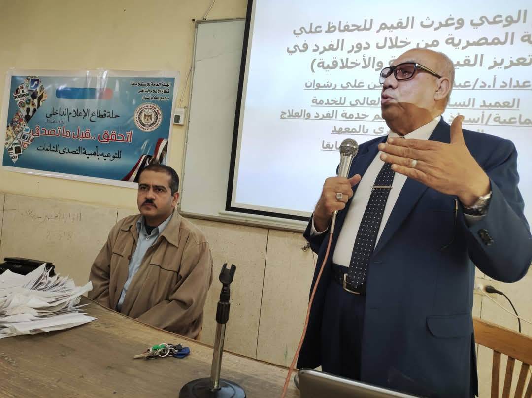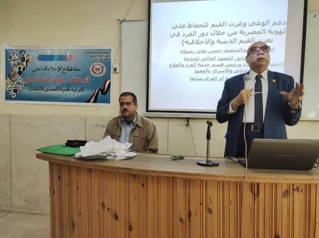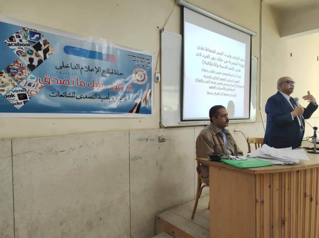 نظم مركز النيل بأسوان، التابع لمجمع إعلام أسوان، ندوة اليوم حول دور الإعلام فى مواجهة الشائعات، وتعزيز القيم الدينية والأخلاقية، وذلك بالتعاون مع المعهد العالي للخدمة الاجتماعية بأسوان، في إطار الحملة الإعلامية المجتمعية التي أطلقها قطاع الإعلام الداخلى بالهيئة العامة للاستعلامات للتوعية بأضرار الشائعات والذي يحمل شعار " إتحقق.. قبل ما تصدق".